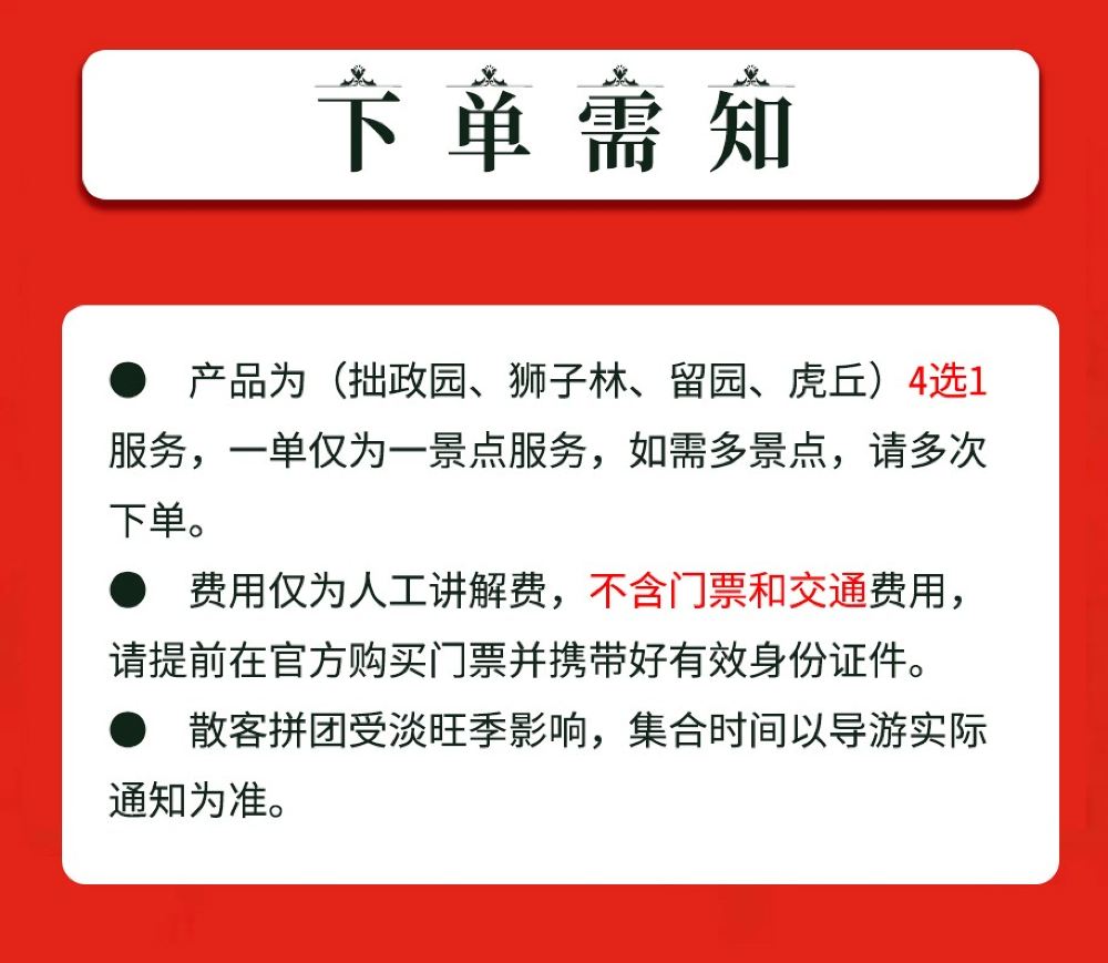 拙政园/狮子林/留园/虎丘 4选1 “古今说”讲解 不含门票【[下单需知]四景点选其一,下单时会有选择具体哪个景点和集合时间。 如需多个景点的精讲,请多次下单。】