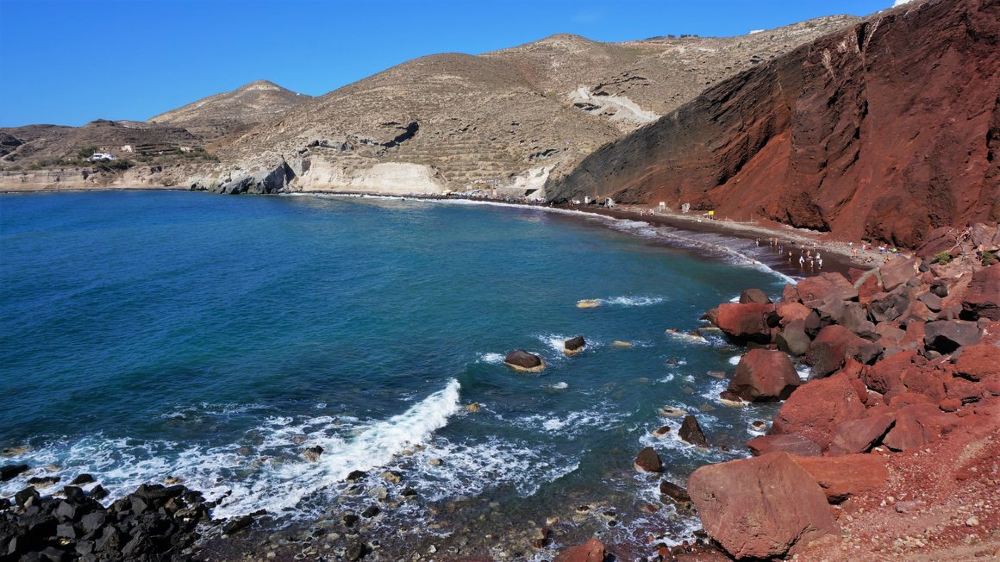 ▲ 火山赤色奇观:红色砂砾与峭壁由铁质火山岩风化形成,色彩对比强烈,适合航拍或远景拍摄; 地质探索:观察海湾地形,因岩壁崩落形成独特地貌(游泳需谨慎,海浪较大);