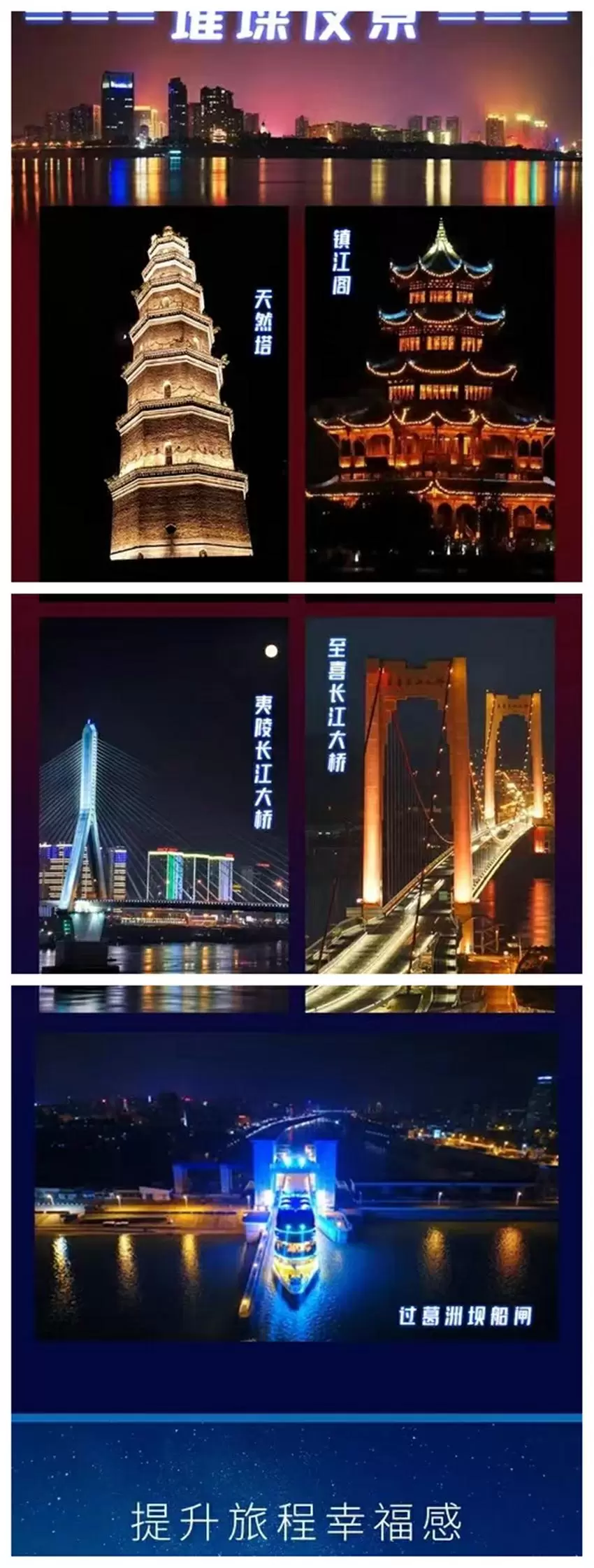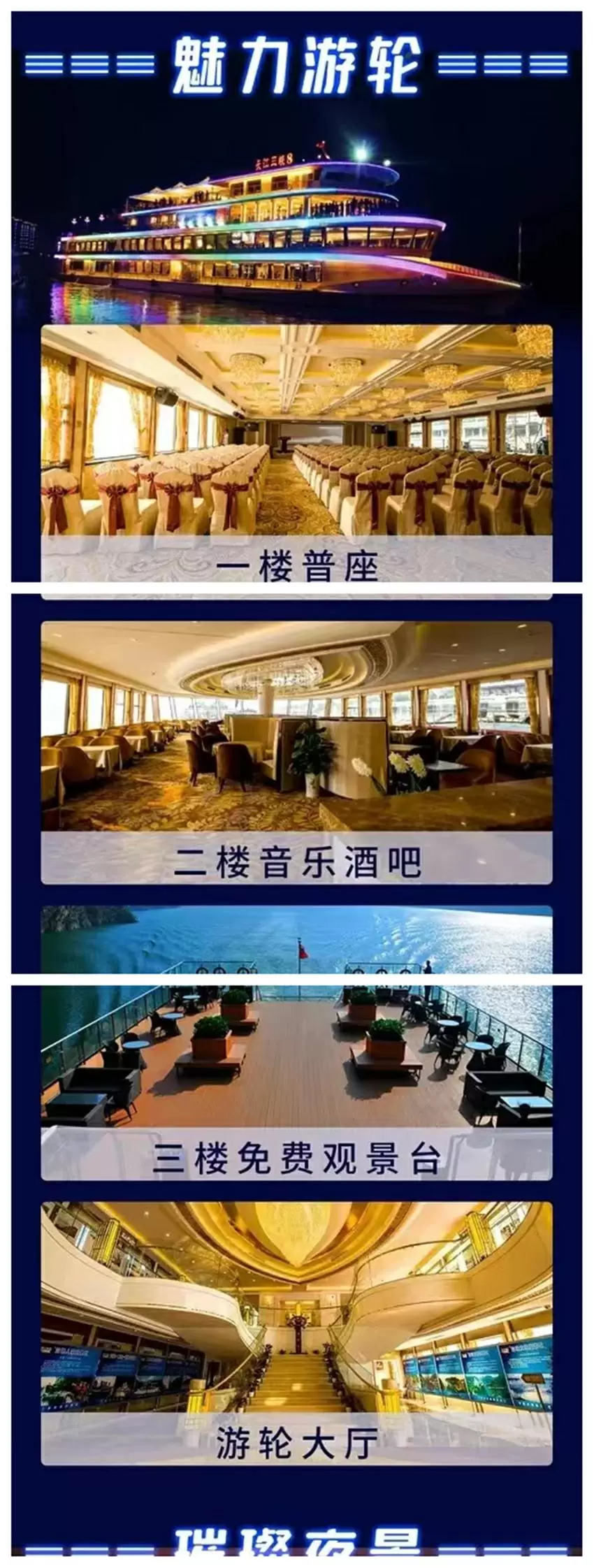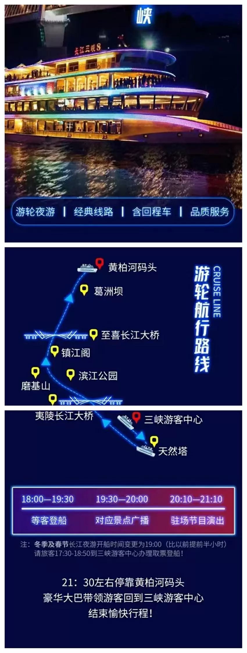 19:00准时开航,请客人必须提前半小时,凭身份证和手机号码在售票窗口取票登船自行登船,必须带身份证!切记:没有导游通知,只有短信提示! 夜游长江行程介绍 18:30抵达前往三峡游客中心(九码头)领取"长江夜游”豪华游轮船票。 19:00豪华游轮鸣笛起航顺水而下,在伍家岗【宜万铁路大桥】附近水域调头上行,沿途欣赏依山傍水的美丽宜昌独具滨江园林特色的城市风貌,感受城市与山水交融、江风轻抚的惬意和畅快!游轮经夷陵古城城标【天然塔】;现代科技与艺术和谐统一的【夷陵长江大桥】;一峰独高、可俯瞰全城的【磨基山】;气势宏伟、威震三江的【镇江阁】;乘船经过万里长江第一坝【葛洲坝】亲历感受水涨船高,体会“经此一门,心甲天下”的豪情! 21:30停靠黄柏河码头,回程旅游大巴带领游客回到三峡游客中心,结束愉快行程! 《游轮活动》 18:00—19:00 游轮等客登船,停泊接待状态; 19:30—20:00 语音广播时段,包括宜昌市情、人文、民风介绍,对应景点广播; 20:10—21:10 驻场节目演出、互动及游客欢唱时段。 《游轮美食》 精美商务简餐类、牛排类、披萨类、特色小吃类、酒水及饮品类. 《长江夜游观大坝包含项目》 1.交运长江8号豪华游轮,回程大巴费用. 2.夜游景观:宜万铁路大桥,天然塔,夷陵长江大桥,磨基山,镇江阁,葛洲坝亲历感受水涨船高. 3.广播讲解服务. 4.旅行社责任险. 《长江夜游观大坝不包含项目》 1.游船上卡座酒水,茶水,零食自愿自理