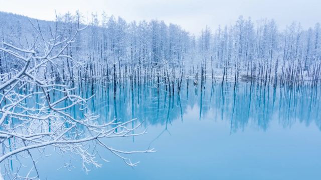 ▲ 【白金青池】 白金青池位于北海道美瑛町东南部,是一处由火山活动与人工干预共同造就的自然奇观。因1988年十胜岳火山喷发后,为防治泥石流而修建的堤坝拦截了地下水脉,水中铝微粒在光线折射下幻化出梦幻的钴蓝色泽。池中枯立的落叶松与白桦树干与澄澈湖面交织,形成超现实的水景画卷,四季皆具韵味——尤其冬季点灯时节,蓝池覆雪与雾凇相映,宛如遗世独立的冰封仙境。