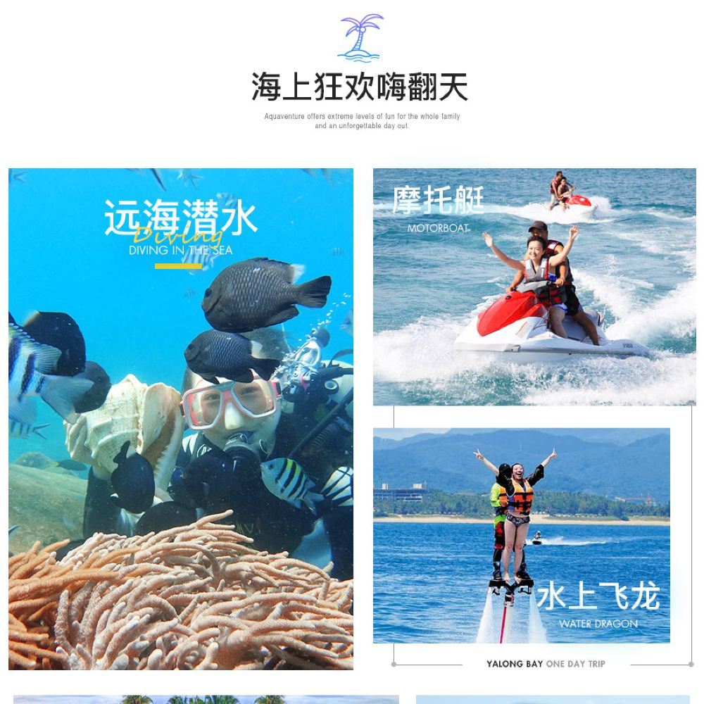 1、精品远海潜水或地中海深潜(鳐鱼/沉船/洞穴/珊瑚/鱼群)二选一2、海上摩托艇或海上飞龙二选一3、急速香蕉船或小黄鸭或海上帆船三选一