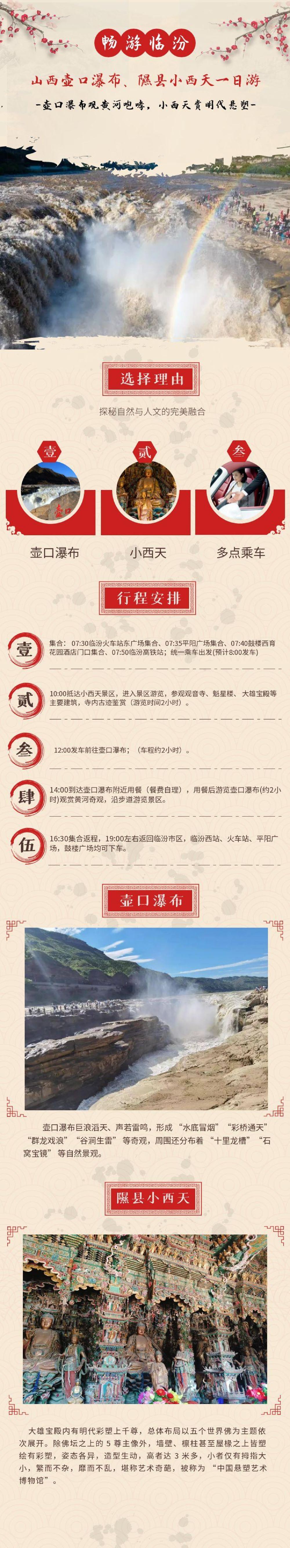山西壶口瀑布+隰县小西天一日游【多点乘车·纯玩·无购物】【一天内串联小西天 “明代悬塑艺术宝库” 的人文底蕴和壶口瀑布 “黄河自然奇观” 的雄浑壮阔】