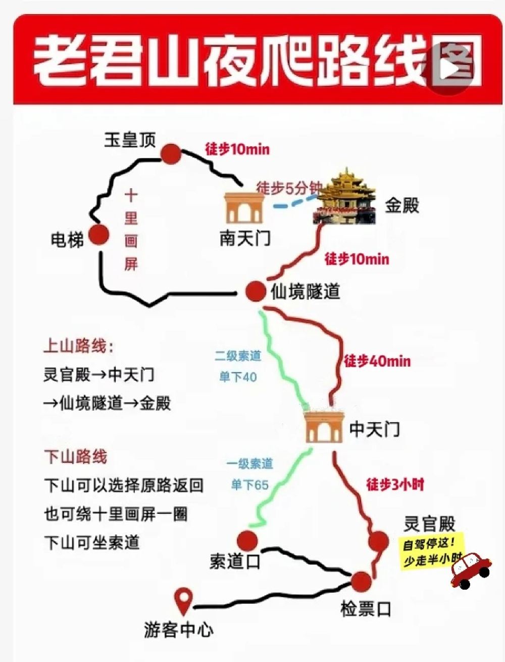 1、夜间索道停止运行,徒步通道无任何交通工具,请大家量力而行。