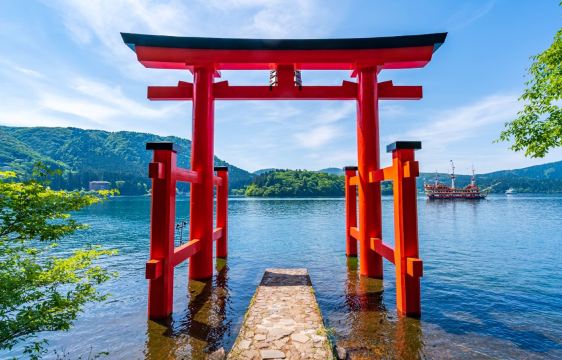 ▲ 【箱根海贼船】 芦之湖的观光船,海贼船肯定是很特别的选择-畅游芦之湖,尽享美丽风光 从元箱根港出发,您可以同时欣赏到巨大的鸟居、富士山和芦之湖的美丽景色。在晴朗的日子里,波光粼粼的湖面与蓝天相映成趣,展现出绮丽、壮观的美景