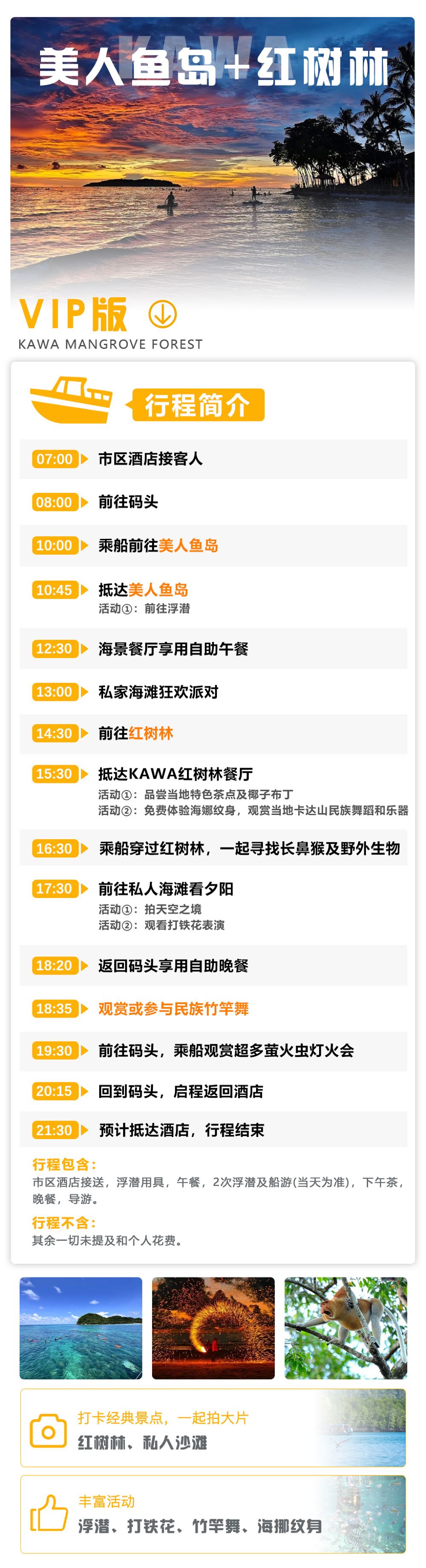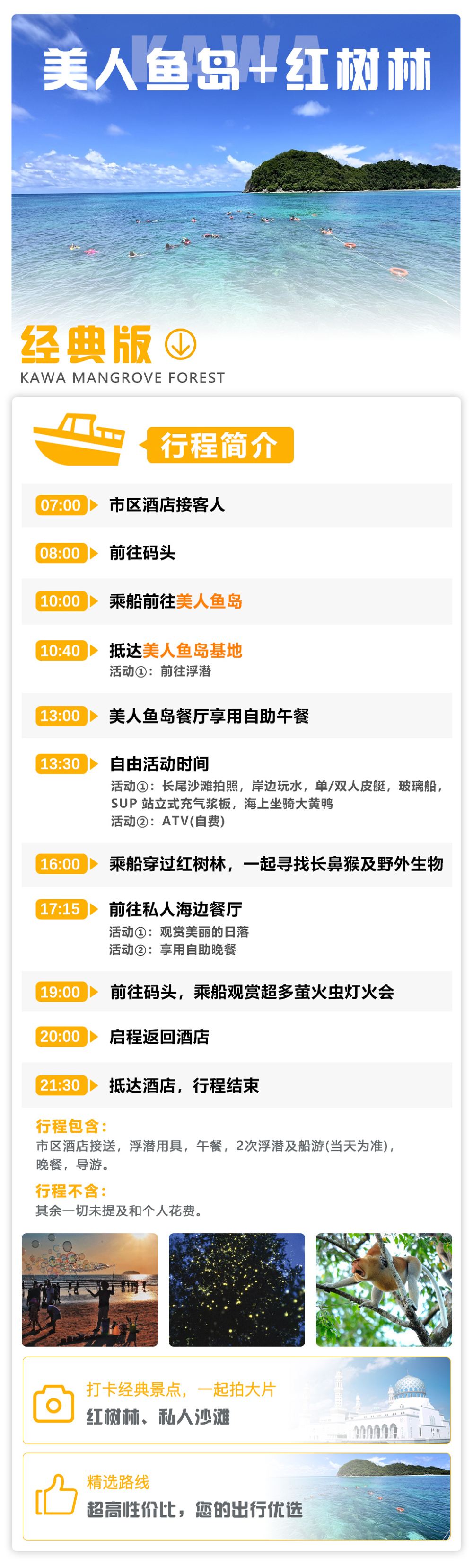 沙巴美人鱼岛+Kawa红树林亚庇一日游【浮潜+寻觅萤火虫】【寻找野生长鼻猴,夜晚探险童年萤火虫】