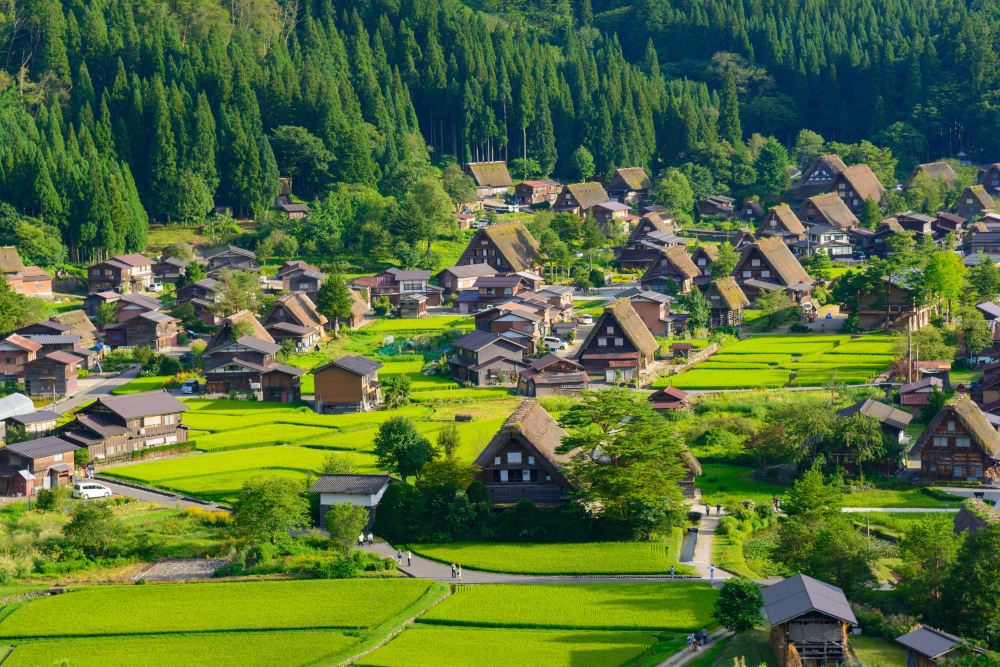 ▲ 【白川乡合掌村落】白川乡四面环山、水田纵横,涓涓河川流经而过,合掌村落房屋的屋顶呈三角形,因与合掌祈祷相似得名。这些偏远的山地村落以及合掌式房屋,于 1995 年成为联合国教科文组织世界文化遗产。