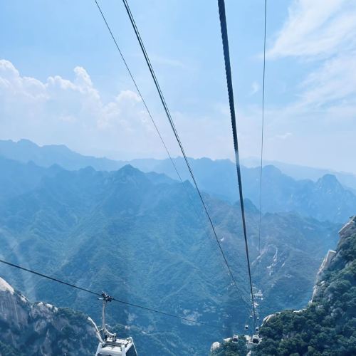▲ 华山西峰索道又称太华索道,是世界首条崖壁开凿硐室站房的单线循环脱挂式索道。线路斜长4211米,高差894米,18分钟可直达西峰,能让游客俯瞰华山壮美景色。