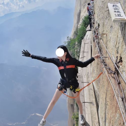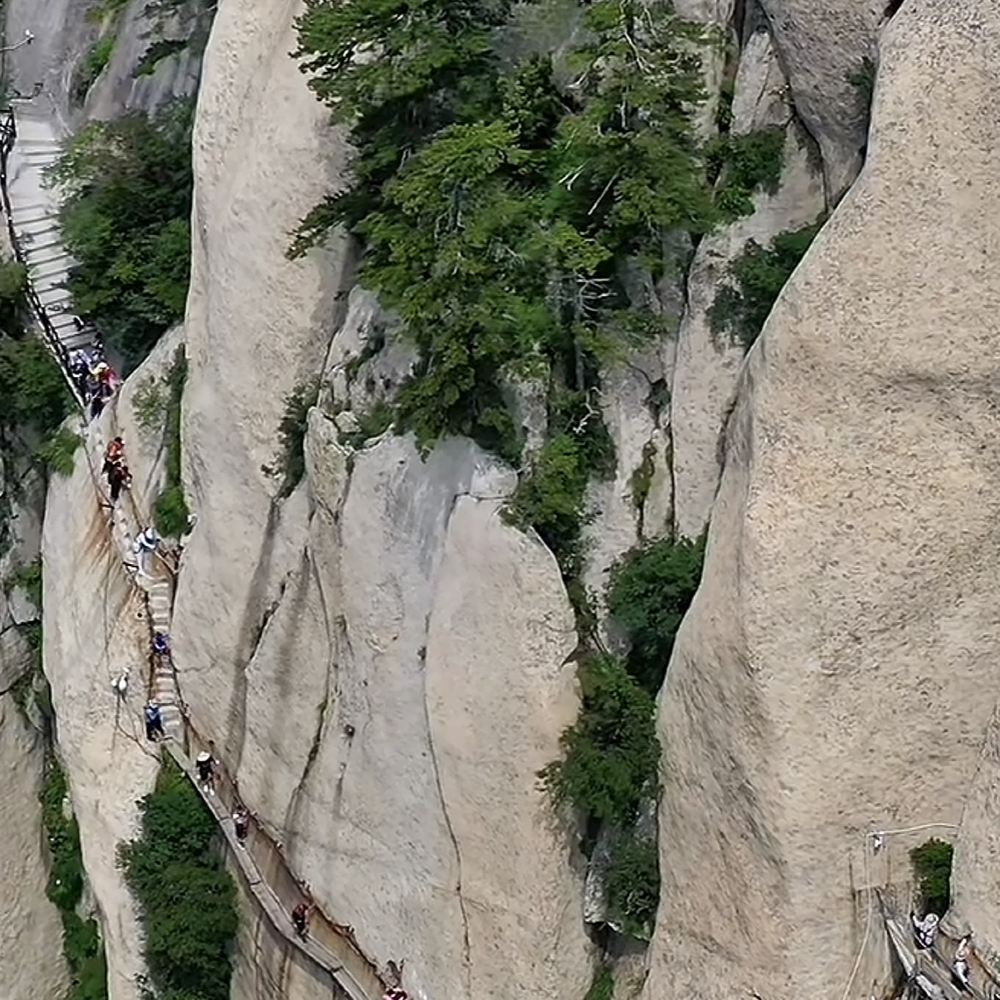 ▲ 长空栈道,悬于南峰2160米绝壁之上。宽不盈尺的木板依崖而搭,铁索为栏,需面壁贴腹、手挽铁链侧身挪步。脚下万丈深渊,风穿峡谷,勇者享凌空快感,怯者难掩心惊,是700年古栈道馈赠的非凡探险体验。