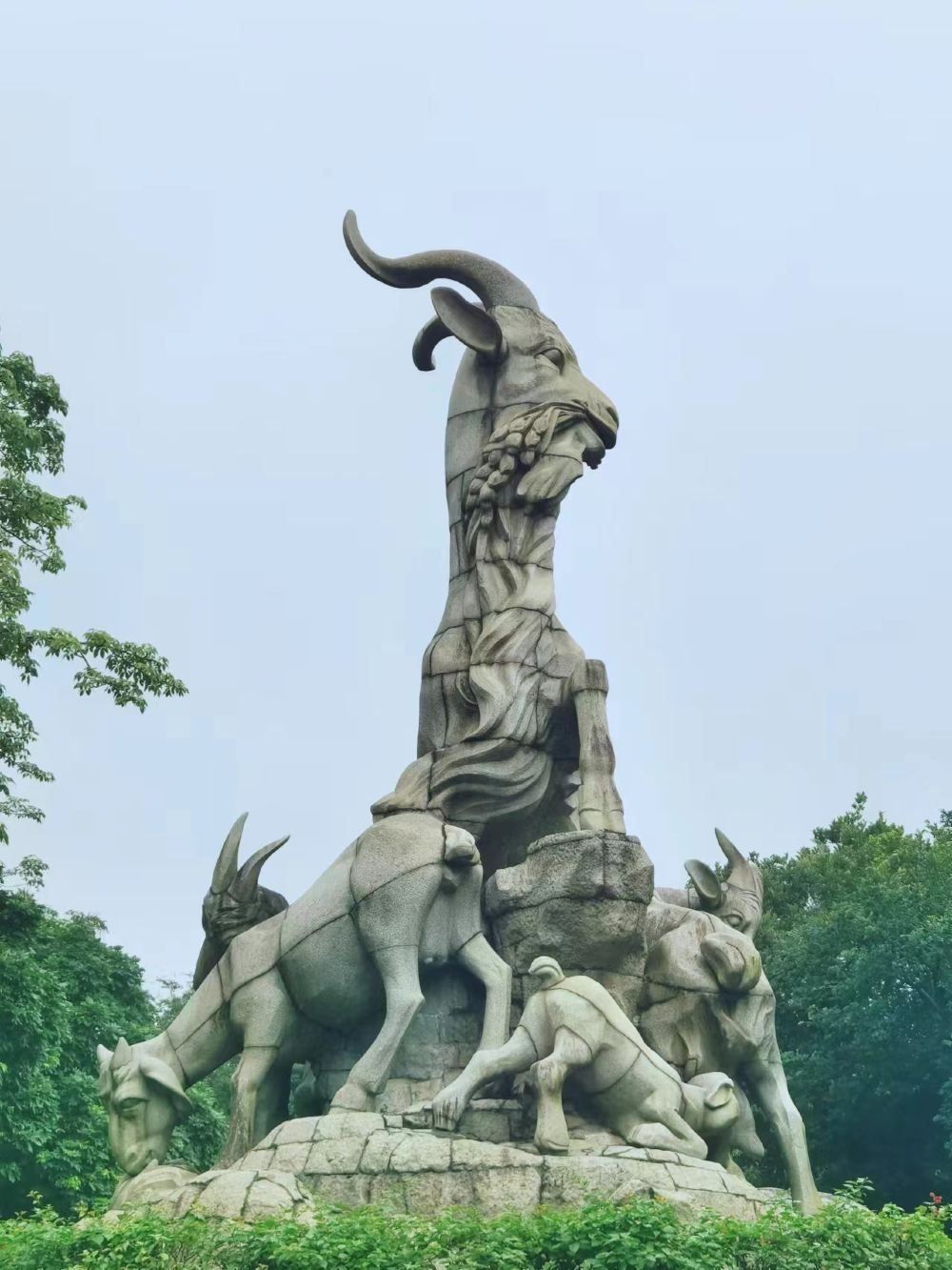 《五羊石像》整个石像连基座高11米。主羊头部高高昂起:口中衔穗,回眸微笑,其余四羊环绕于主羊周围,或戏要或吃草。