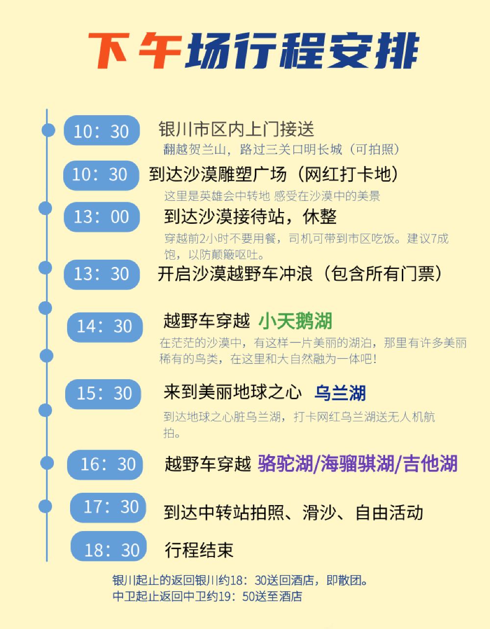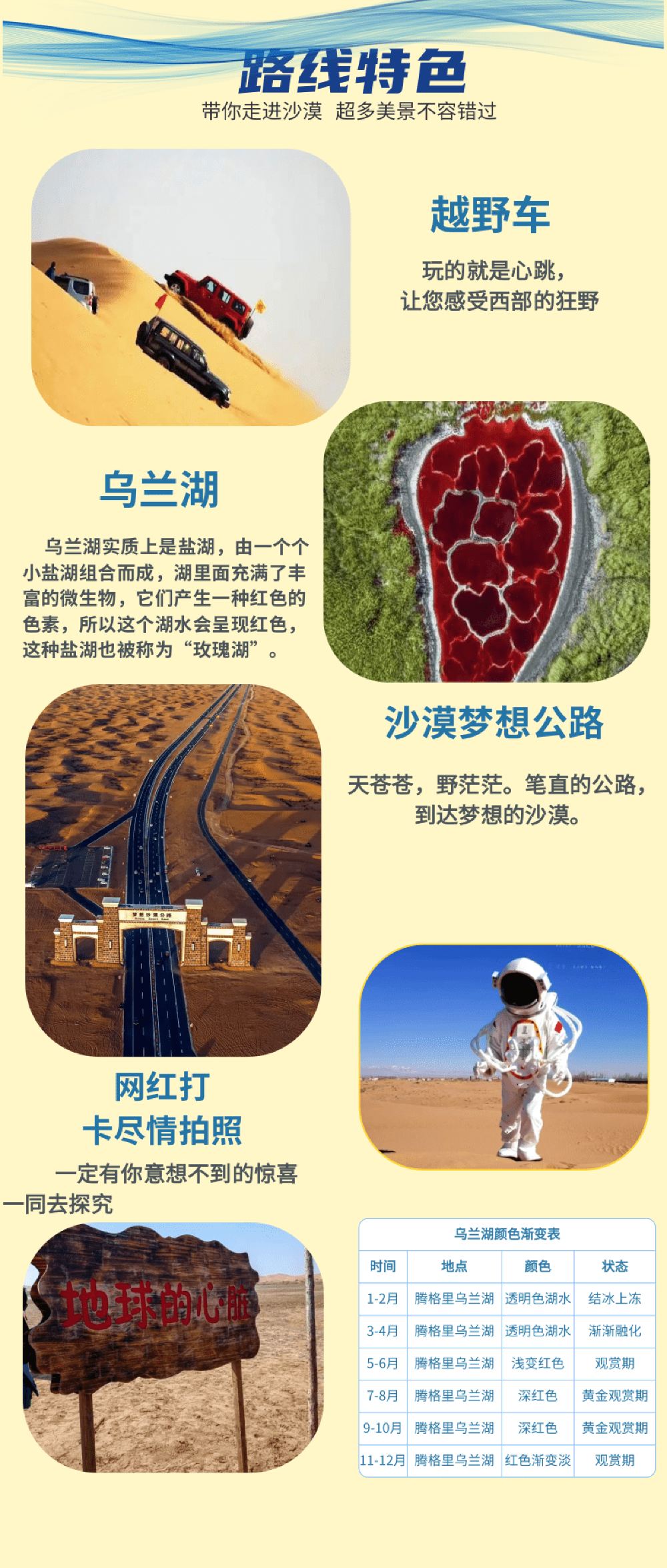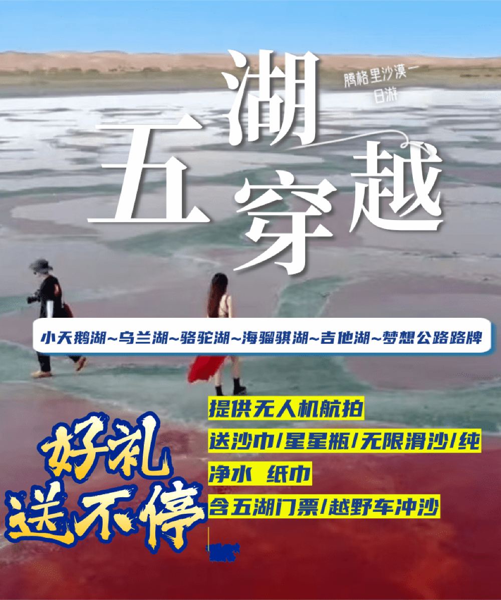 宁夏银川腾格里沙漠+乌兰湖+骆驼湖一日游【五湖穿越纯玩团】【[五湖穿越]乌兰湖/骆驼湖/海溜骐湖/天鹅湖/吉他湖!纯玩,含门票,当地专业越野车领队司机兼向导;】