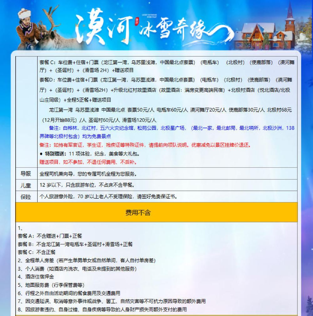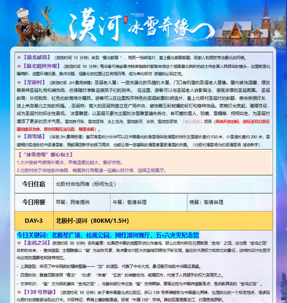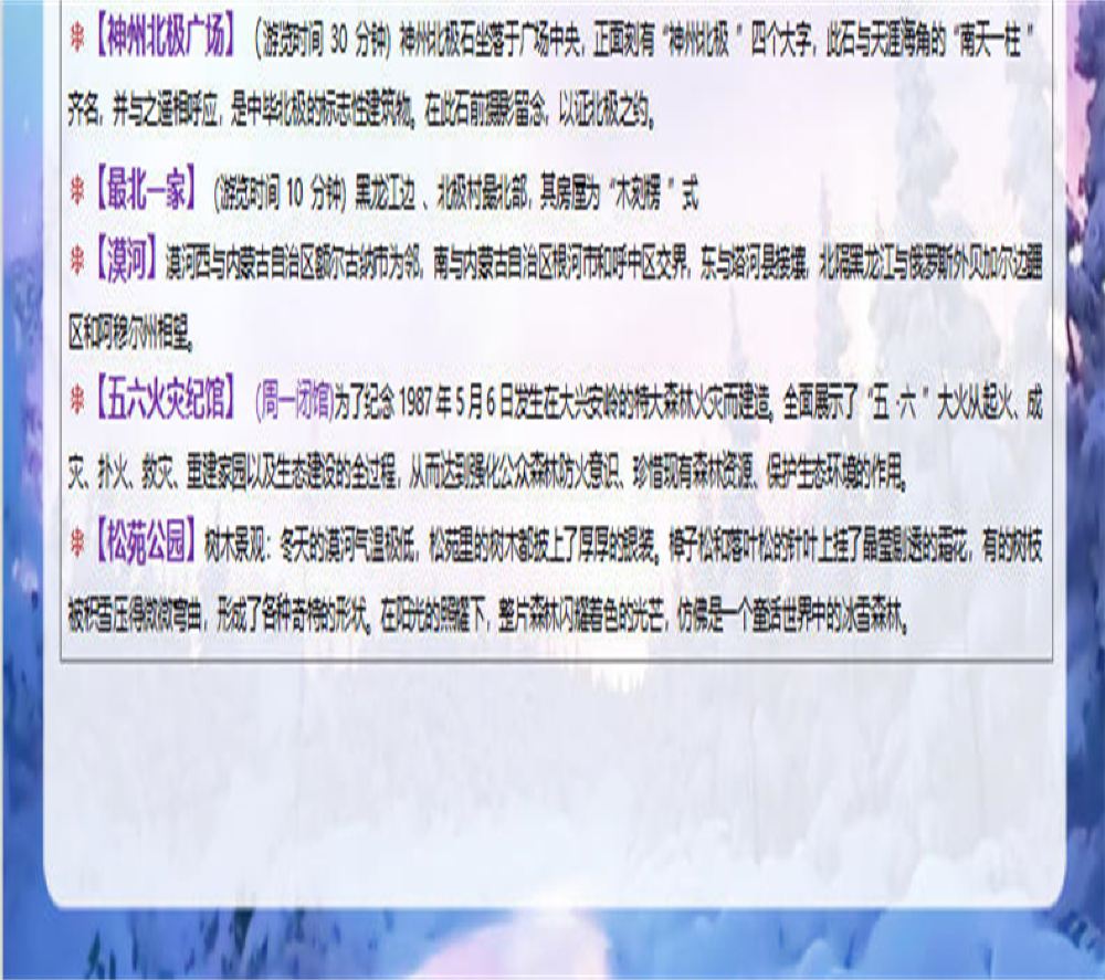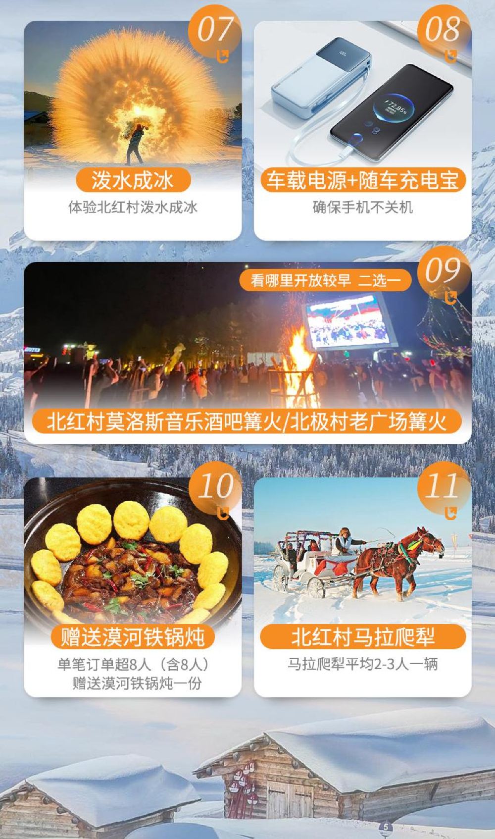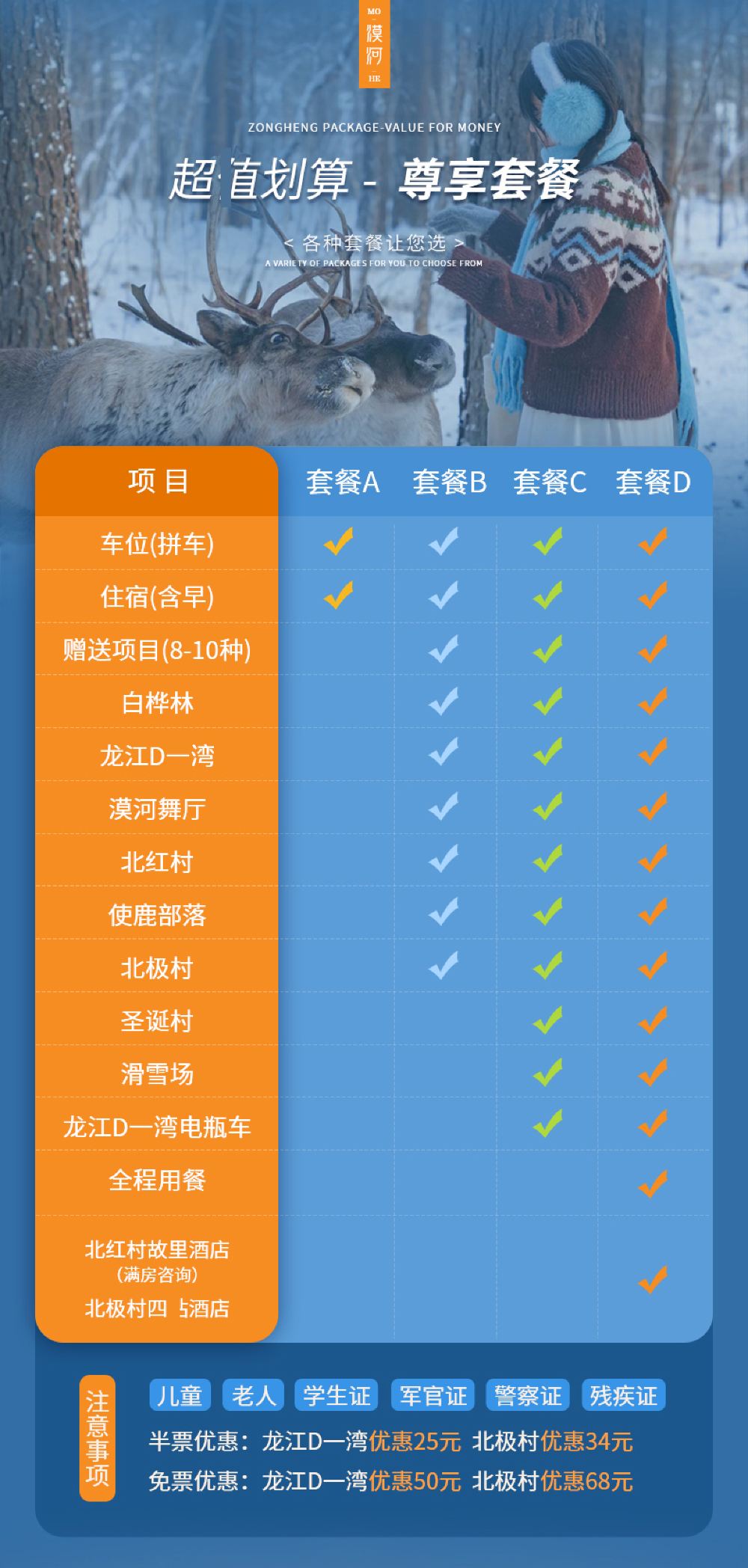 门票:龙江第一湾+电瓶车,北极村,漠河舞厅,鹿苑,圣诞村,滑雪场
