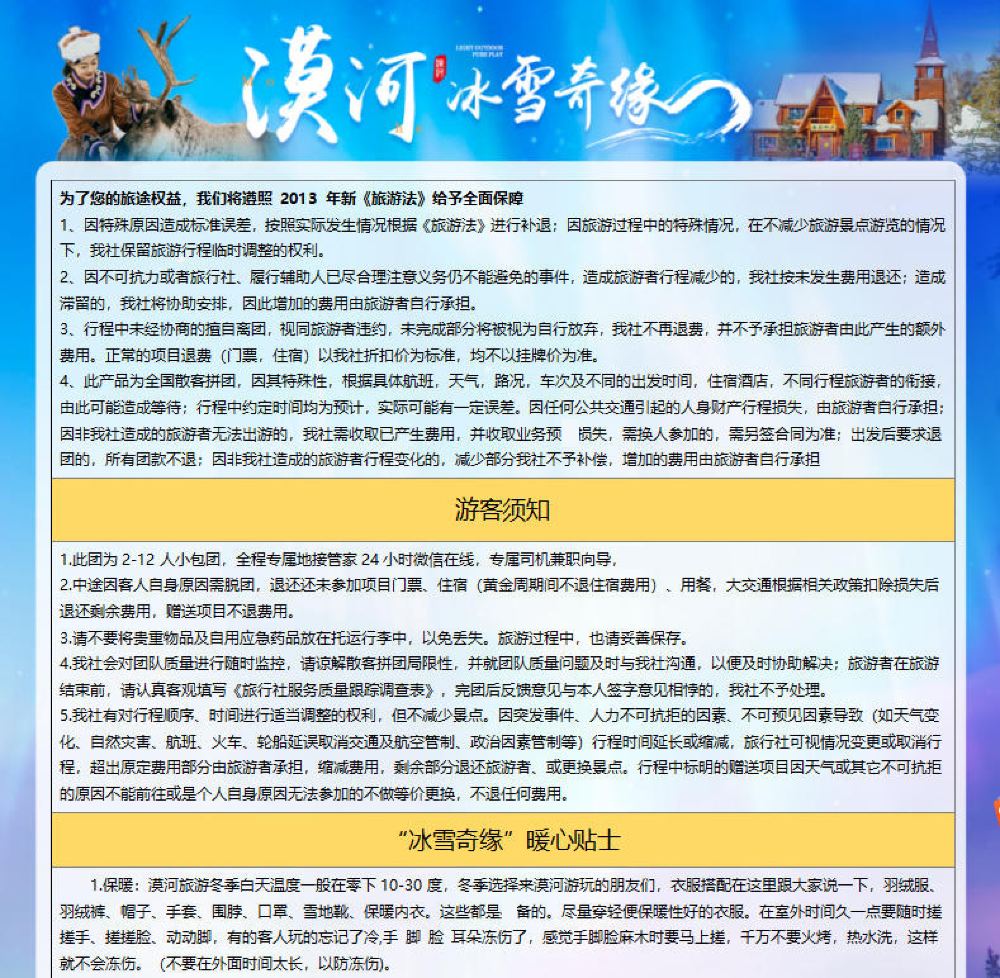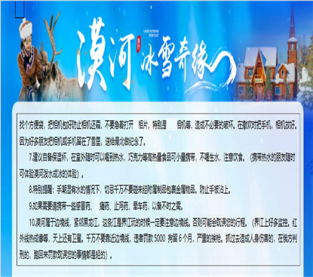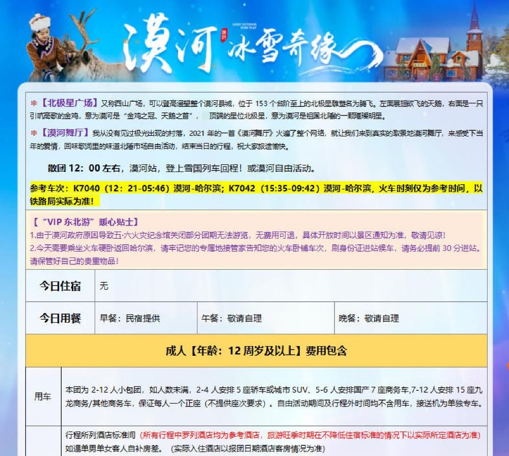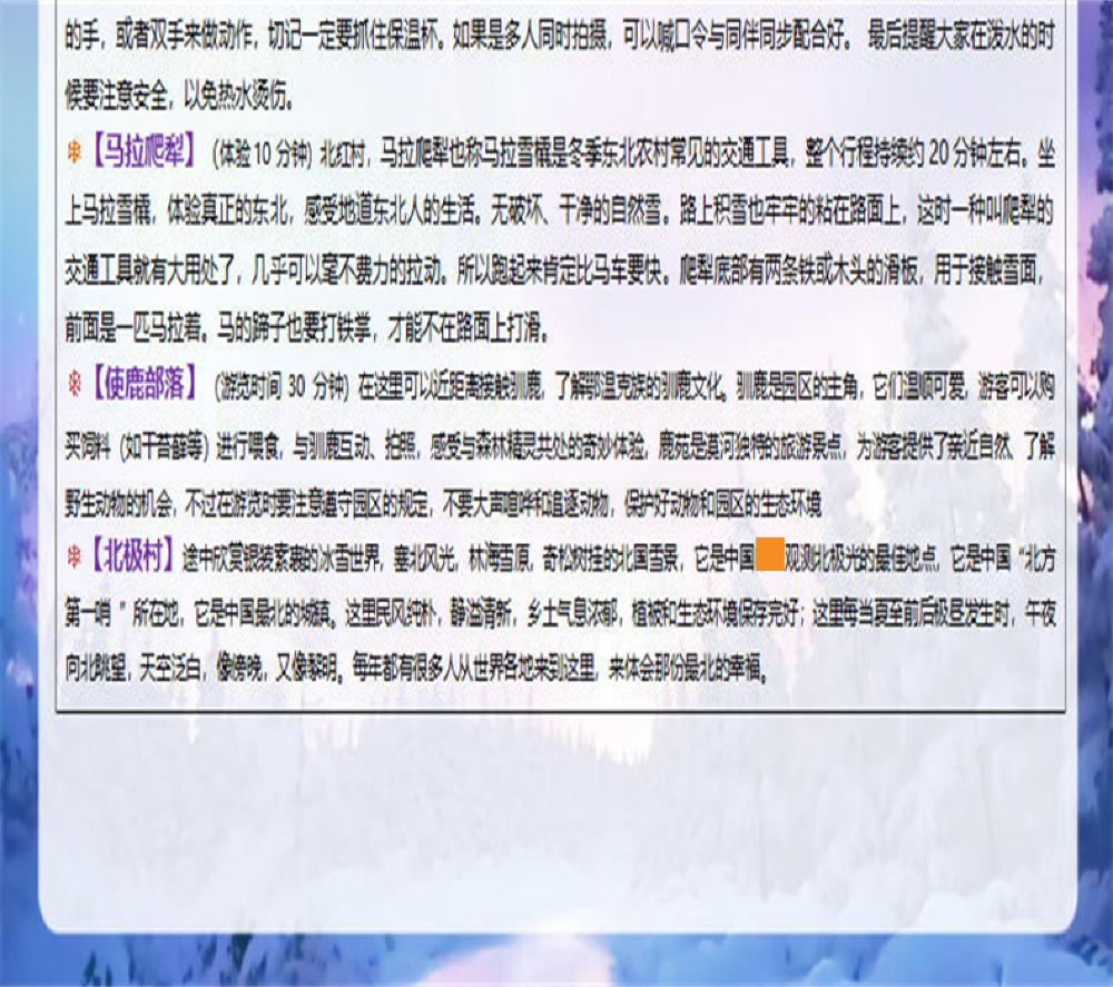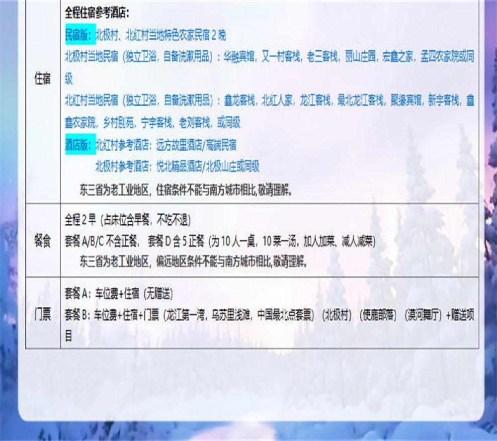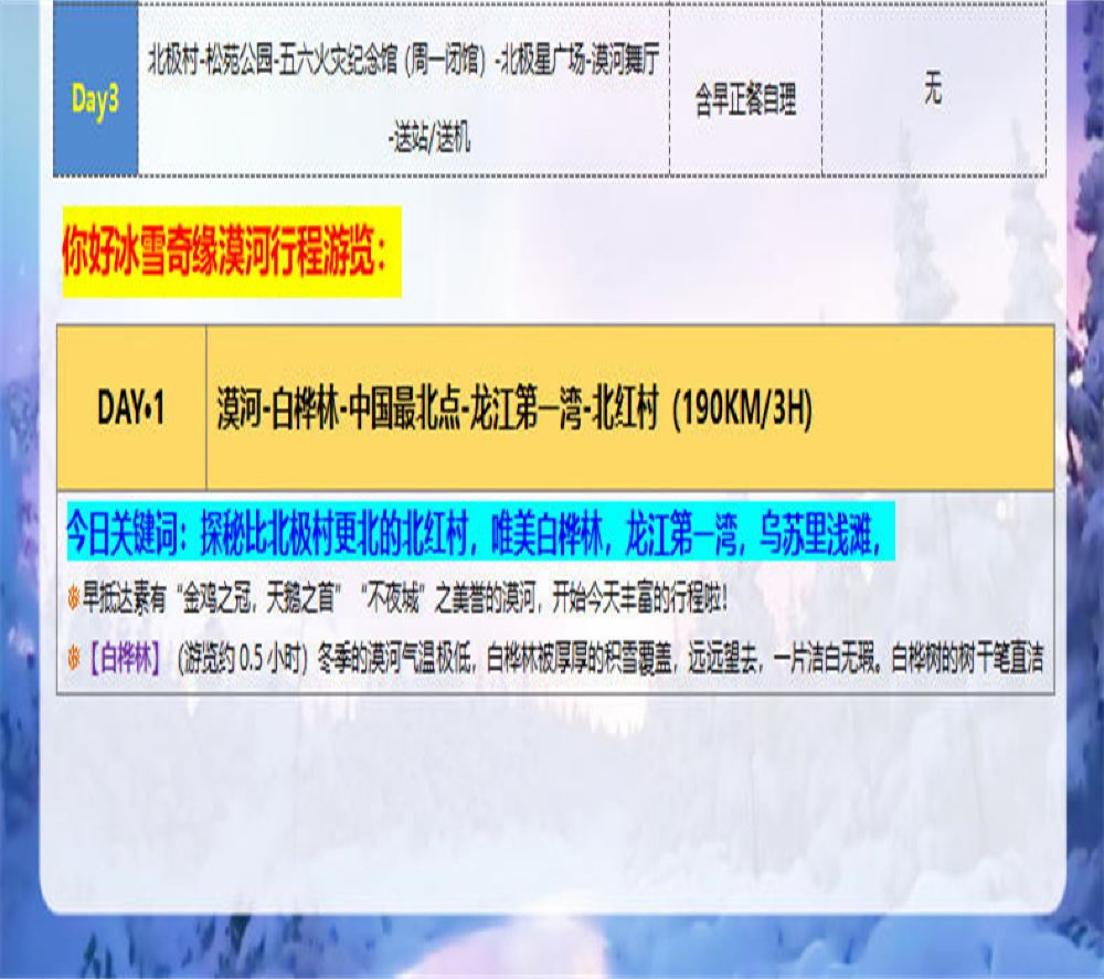 门票:龙江第一湾+电瓶车,北极村,漠河舞厅,鹿苑,圣诞村,滑雪场