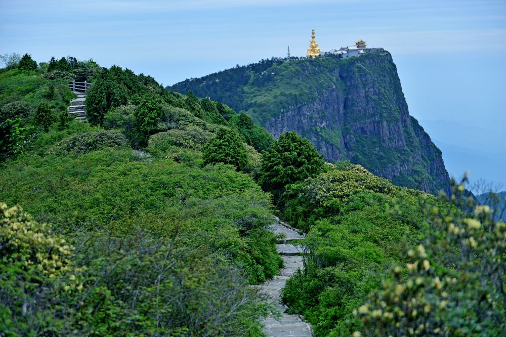 途中可观赏野生猴子(此地为峨眉山大的野生猴区分布地,乘坐索道(上行 65,自理)登至峨眉主峰—金顶(海拔 3077),朝