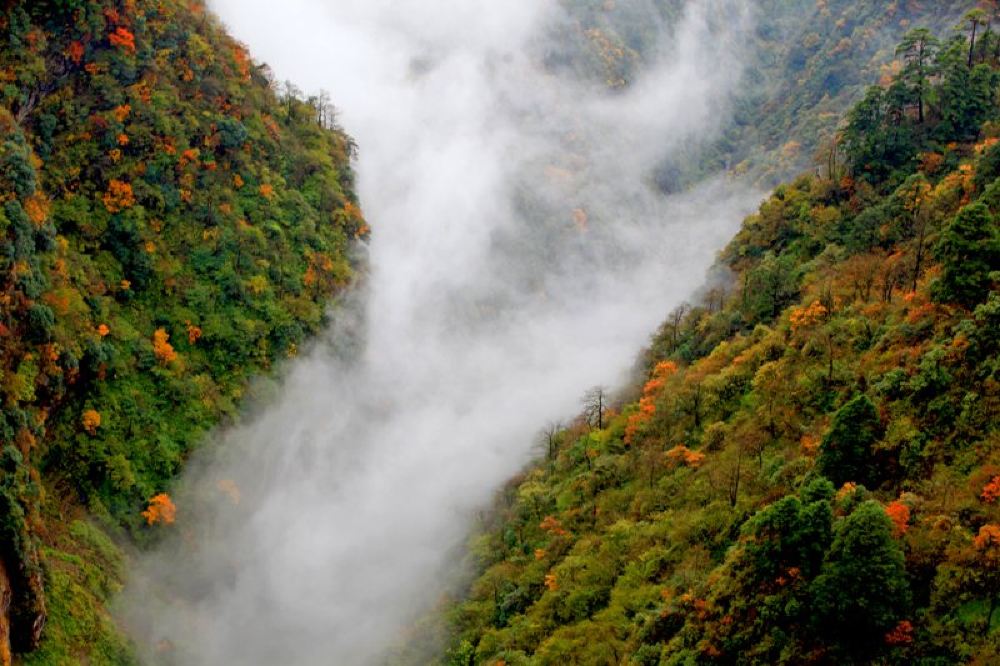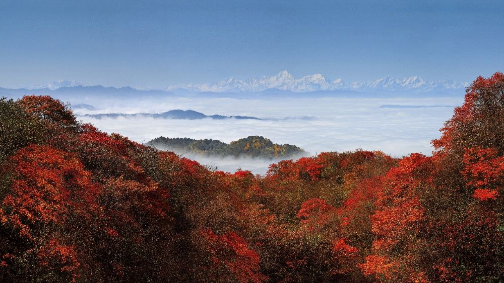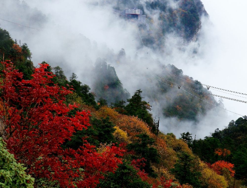 然奇观。远眺贡嘎山和瓦屋山。。。。。。结束后乘坐索道(下行 55 元,自理)前往接引殿,原路返回雷洞坪乘车前