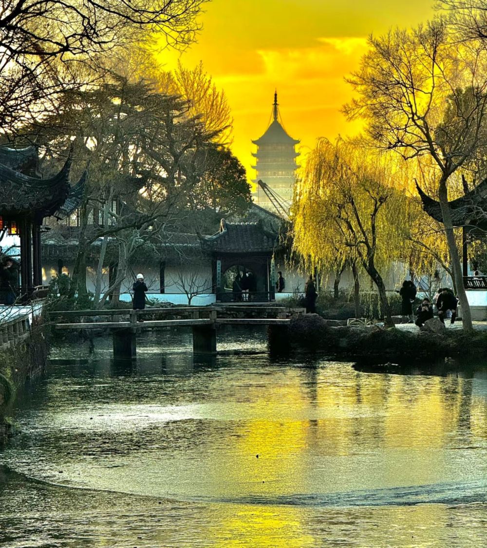 ▲ 刻画园林黄昏盛景,金黄天空下,古典亭台、石桥与水面倒影相映,远处古塔在暮色中若隐若现,柳枝泛黄