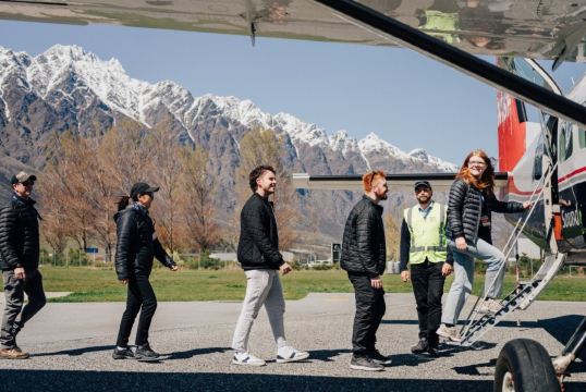 当你飞回南阿尔卑斯山时,鸟瞰大部分未被破坏的地区,完成你的旅程,在皇后镇降落时,你会在空中看到惊艳的蓝色瓦卡蒂普湖。