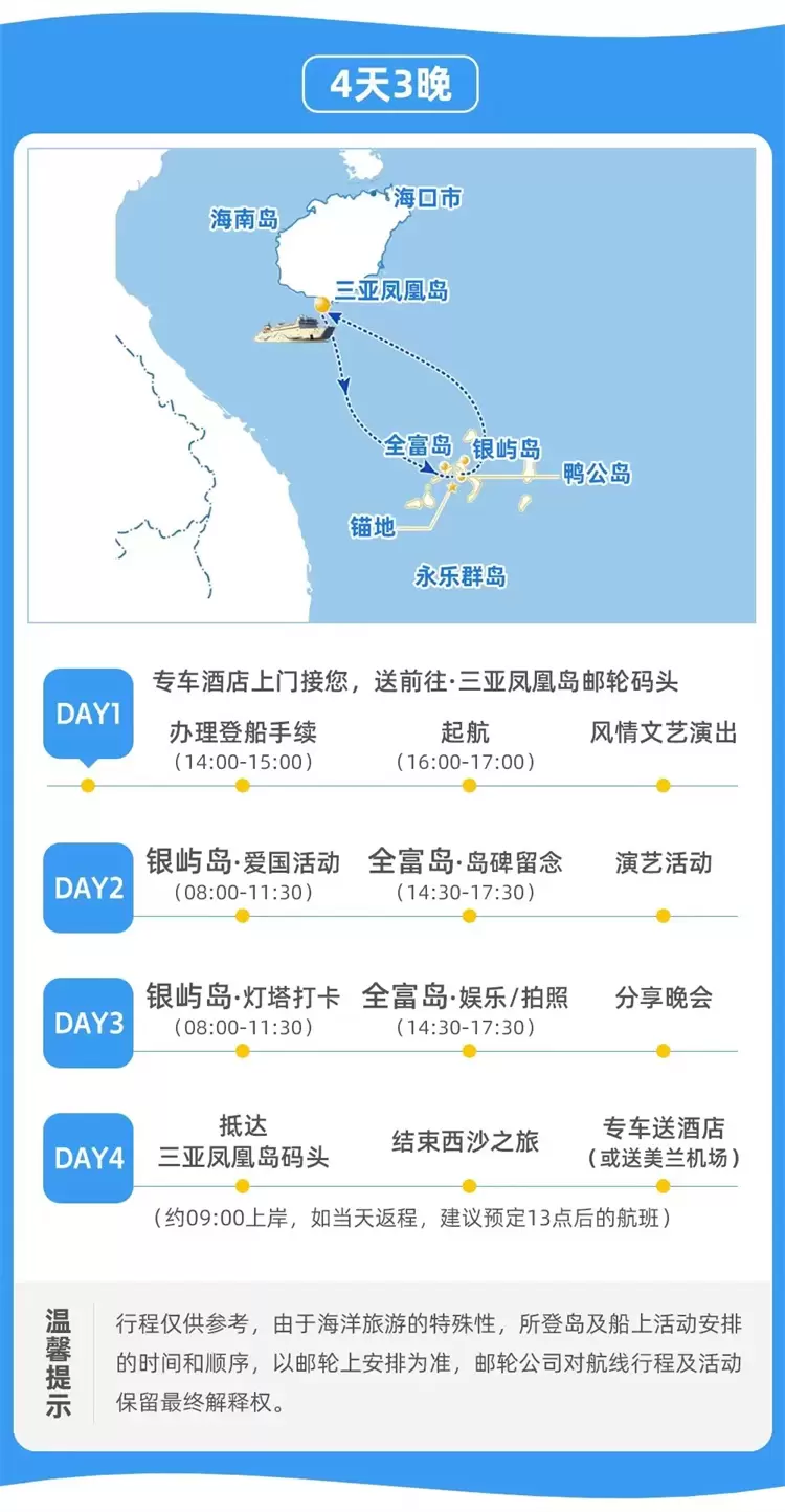 3、由于西沙线路特殊,年龄限制10—70岁,不在年龄范围的需要提交资料申请通过才能预订。