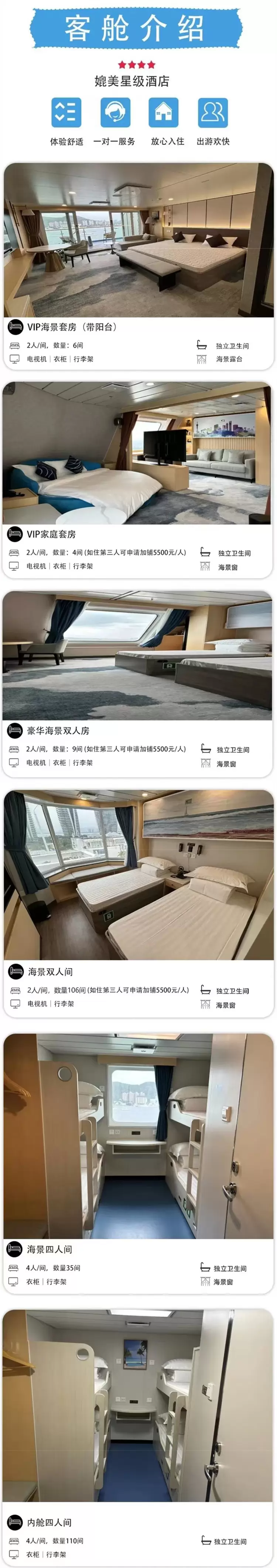 祥龙岛号”轮 房型:海景六人间,内舱四人间,海景四人间,海景双人间,豪华双人间,家庭套房,海景套房。(所有房型,房间都带有卫浴)