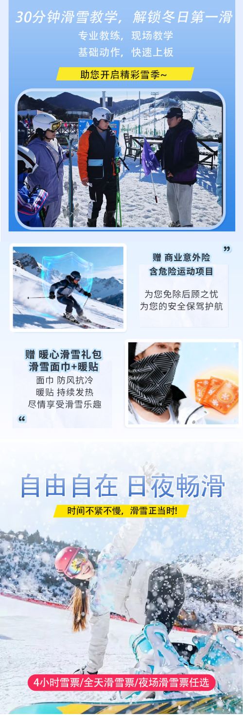 5.所赠的滑雪险仅限中国大陆居民身份证,限出行前一天晚2300前下单享受,过时下单游客将无法享受赠品滑雪险服务(超时无法补保,望您谅解)。