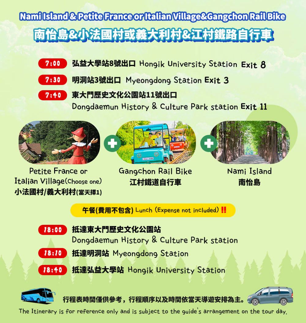 南怡岛+小法国或义大利村+江村铁轨自行车一日游【南怡岛: 韩剧《冬季恋歌》取景地,四季皆美,有银杏大道、骑行小路与湖边美景,浪漫又放松。】