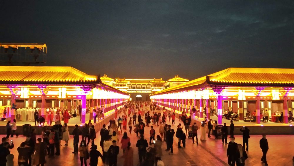 景区建有凯旋楼、明德门、朱雀廊、东西市等建筑群,高大的古典建筑与汉水粼粼波光相映成趣,踏入大门后仿佛穿越时空梦回唐朝,夜游至此更是别有一番风味。这里还是影视拍摄基地,《妖猫传》便是在此取景的。