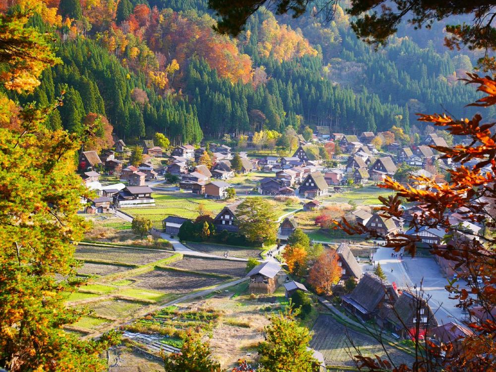 ▲ 白川乡四面环山、水田纵横,涓涓河川流经而过,被称为森林和溪流的王国。白川乡荻町的村落是三个被登录为世界遗产的村落(白川乡、五箇山的相仓和菅沼)中,户数最多的村落,有 152 户。灵峰白山所流出的大白川,与庄川汇合后会变得雪白浑浊,这就是白川乡地名的由来。城山展望台在白川乡荻町合掌村的东北部,在这里,合掌村和绵亘的白山一览无遗。