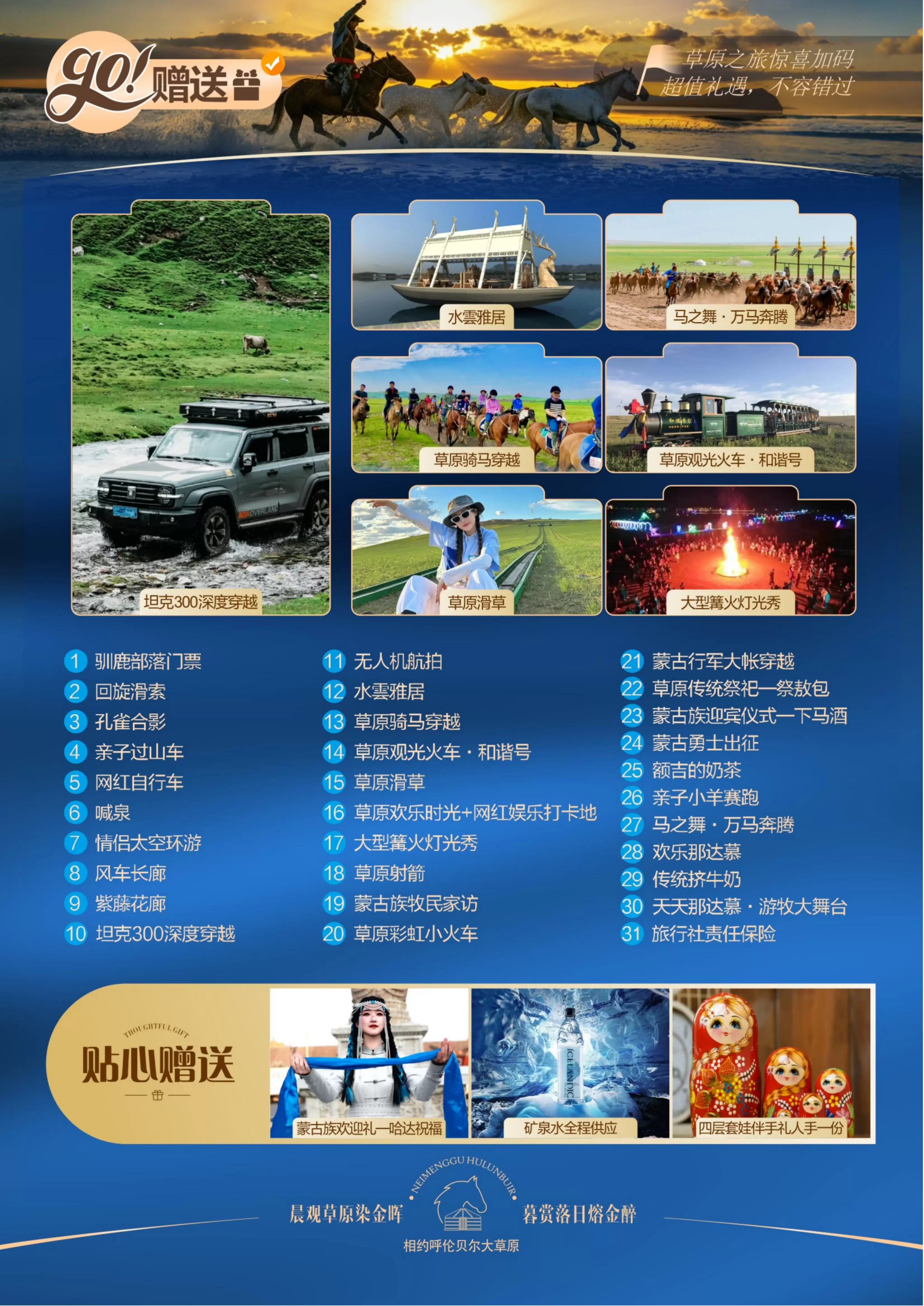 12、水雲雅居13、草原骑马穿越14、草原观光火车·和谐号15、草原滑草