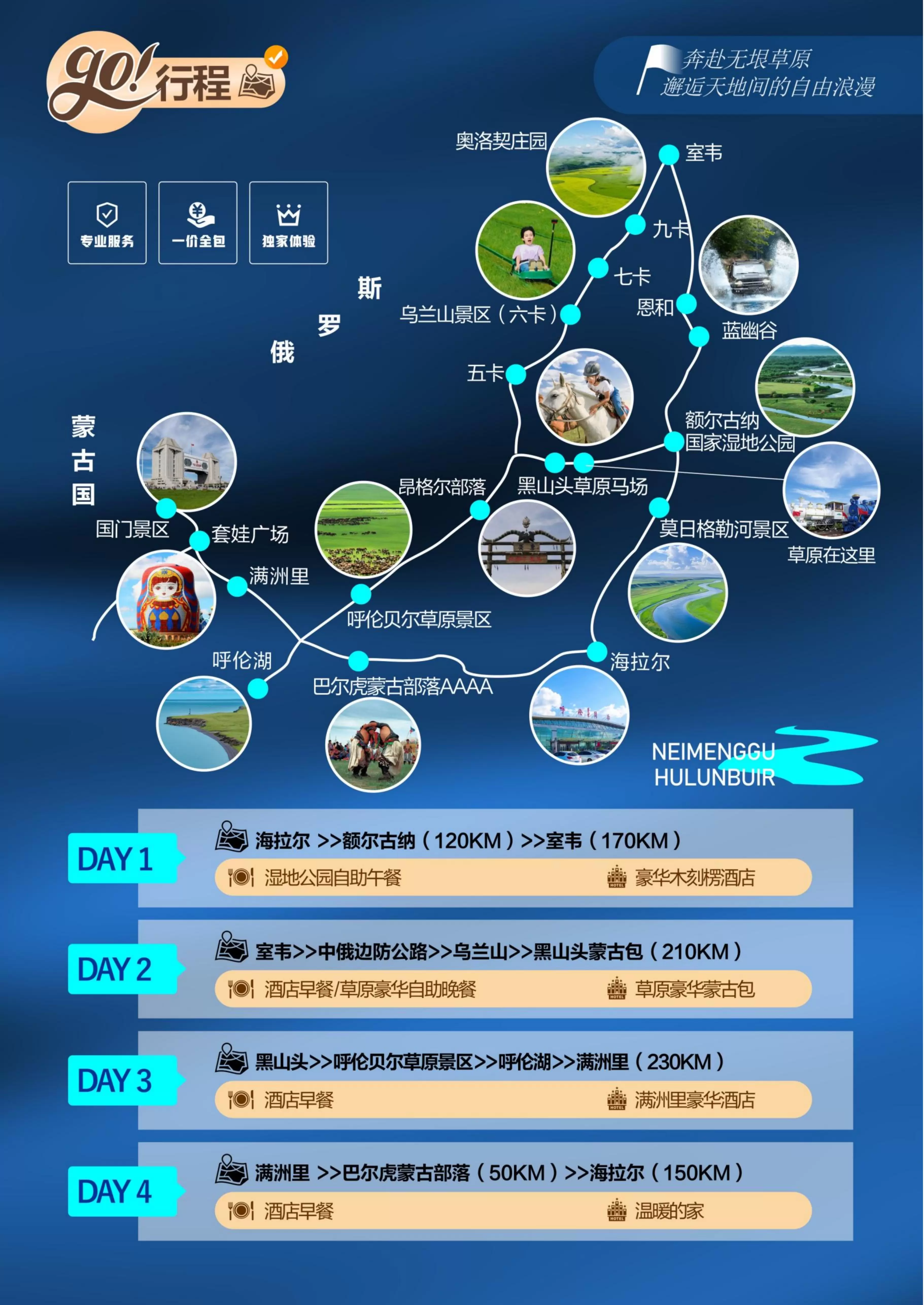 甄选景点:行程中所列景点均为呼伦贝尔经典景区景点,拒绝擦边球式的不收费用景点;