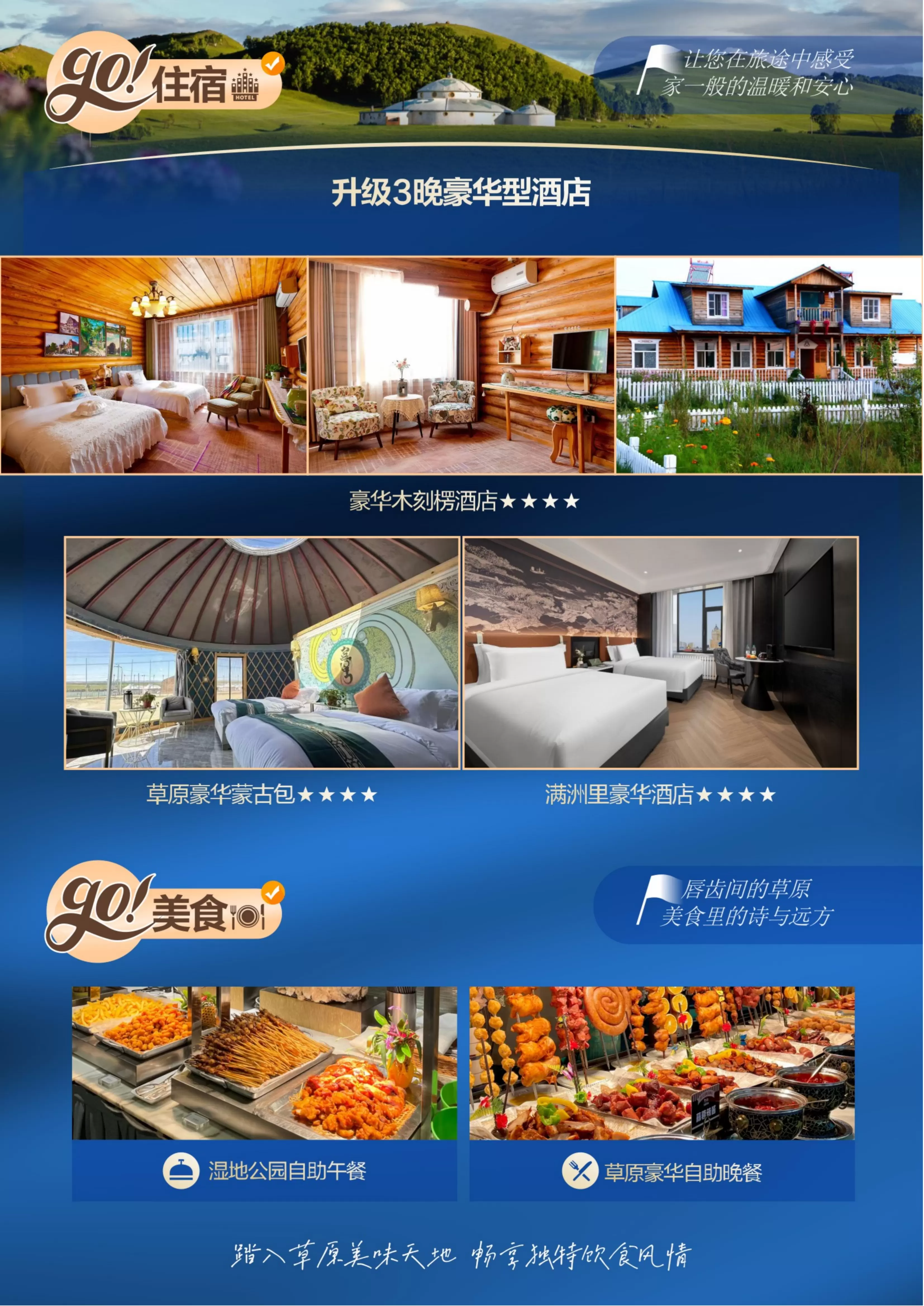 特色美食:湿地公园自助午餐、草原豪华自助晚餐;