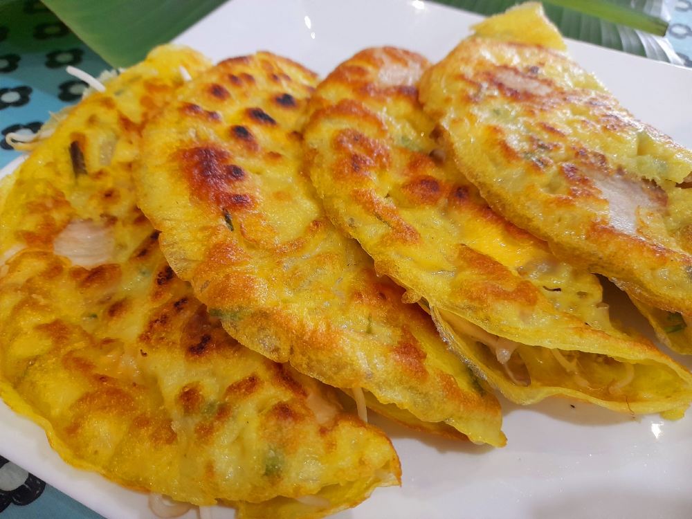 ▲ 酥脆的煎饼里包裹着猪肉和虾仁,用香草包裹,还有肉酱和芝麻酱卷成的饺子。