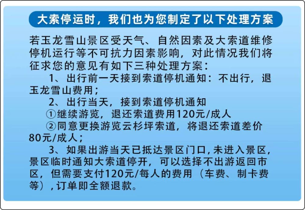 2.因玉龙雪山景区处于高海拔地区,如遇雨雪天气,景区多雾能见度较低,可能会影响您的游览体验,请游客朋友知晓并在游玩过程中注意脚下安全。
