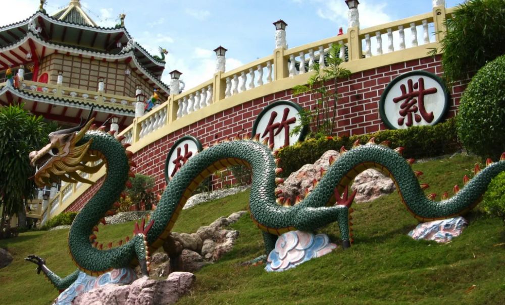 ▲欣赏宿务道教寺庙中引人注目的龙形雕塑,该寺庙是道教信徒的重要礼拜场所。
