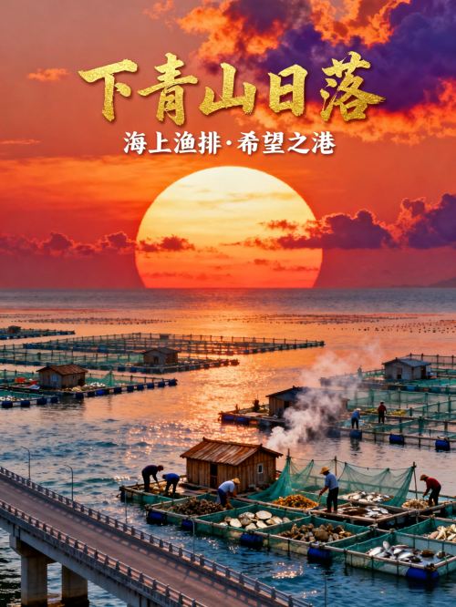 日落比日出更成熟,太阳是主角,等早晨它出生时,对一切充满好奇,等一天过去了,它要降落时,一切都被它看透了。如果日出是希望的开始,那日落就并不是失望的起点,而是一个等待美丽希望的过程。站在下清山特大桥上,向东西两面放眼望去,一望无际的渔排,伸向远方,象一座座飘浮在海上的小镇,在落日的映照下非常壮观,这些渔排下面是水下网箱,养殖着鲍鱼。黄花鱼、蟹、海参、贝类等海产品,渔民生产养殖,生活居住都在这些渔排上,在这里可以感受到真正的渔家风情。