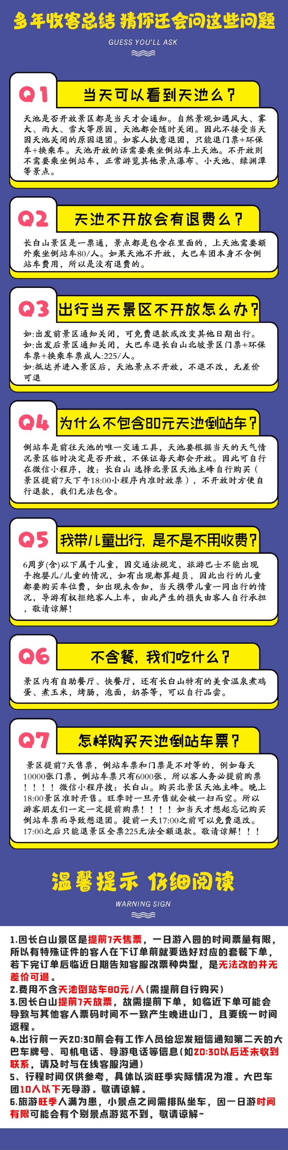 如因长白山天池景点关闭要求临时退团,出发前一天18:00之前免费退改,18:10-23:59分退团损失订单金额30%,出行当天不可取消,敬请谅解。(天池景点是否关闭,都是当天以景区通知为准,旅行社无法提前预判!!!)长白山景区门票需提前7天进行抢票,在您预订成功后,我们将竭尽全力为您抢票。