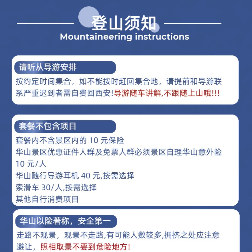 ▲ 因费用包含 1.门票:华山门票,往返索道,进出山车景区内交通2.交通:空调旅游巴士,酒店-景区往返接送 3.导游:专业中文导游讲解 4.中餐:登山能量包(自热米饭、矿泉水、丝带、手套)5.保险:旅行社责任险,建议自行购买旅游意外保险