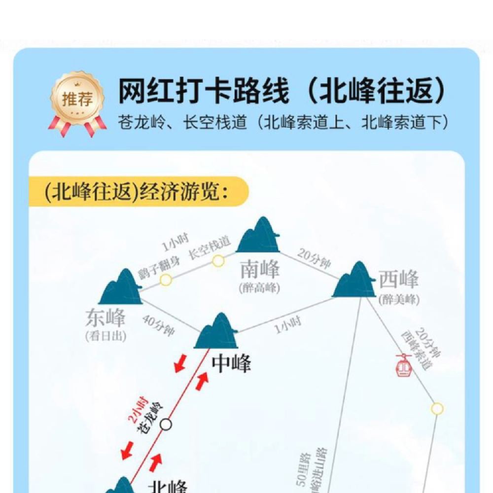 ▲ ️登山路线(西上北下经典线): 西峰索道(20分钟): 穿越云雾瞰「青龙背」脊线,360°全景玻璃轿厢拍vlog神器 沉香救母石(30分钟): 触摸斧劈纹路,解锁宝莲灯同款仙侠大片(导游指导构图pose) 南峰极顶(1小时): 登顶2154.9米海拔碑,体验30元长空栈道(恐高可选观景台拍照) 东峰鹞子翻身(40分钟): 垂直岩壁挑战胆量,悬崖秋千视角俯瞰峡谷 北峰论剑台(1小时): 持免费木剑道具,与金庸题字碑演绎武侠情怀