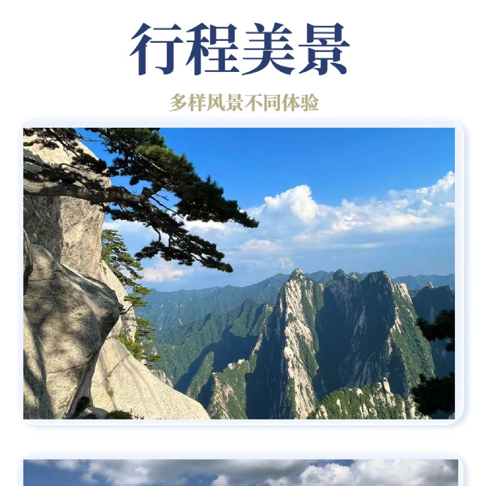 ▲ 行程亮点: 西峰索道直达精华段,省时省力打卡「沉香劈山石」「长空栈道」网红地标 专业导游带队,金庸笔下的「华山论剑」江湖传说 灵活返程循环车,最晚18点下山不赶路 纯玩0购物,含门票/索道/车费/保险,赠送登山手套+能量补给包