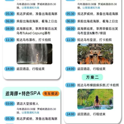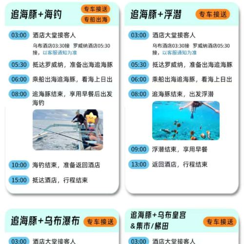巴厘岛罗威纳追海豚一日游【可选浮潜海钓漂流火山ATV滑翔伞】【日出时分罗威纳海域,野生精灵追海豚,适合男女老少】