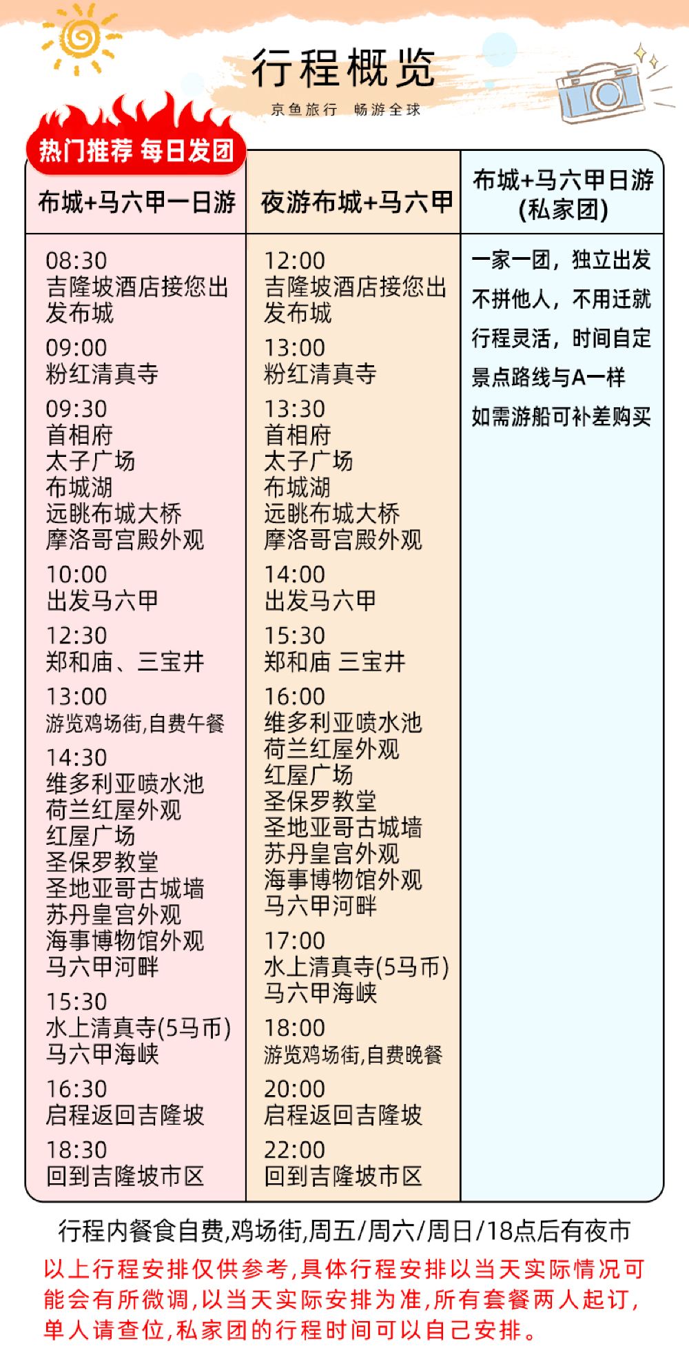 吉隆坡出发布城马六甲一日游散拼6人以内精致中文小团:每天早上8:00-8:30市区酒店接送,18:00左右送回吉隆坡市区酒店。
