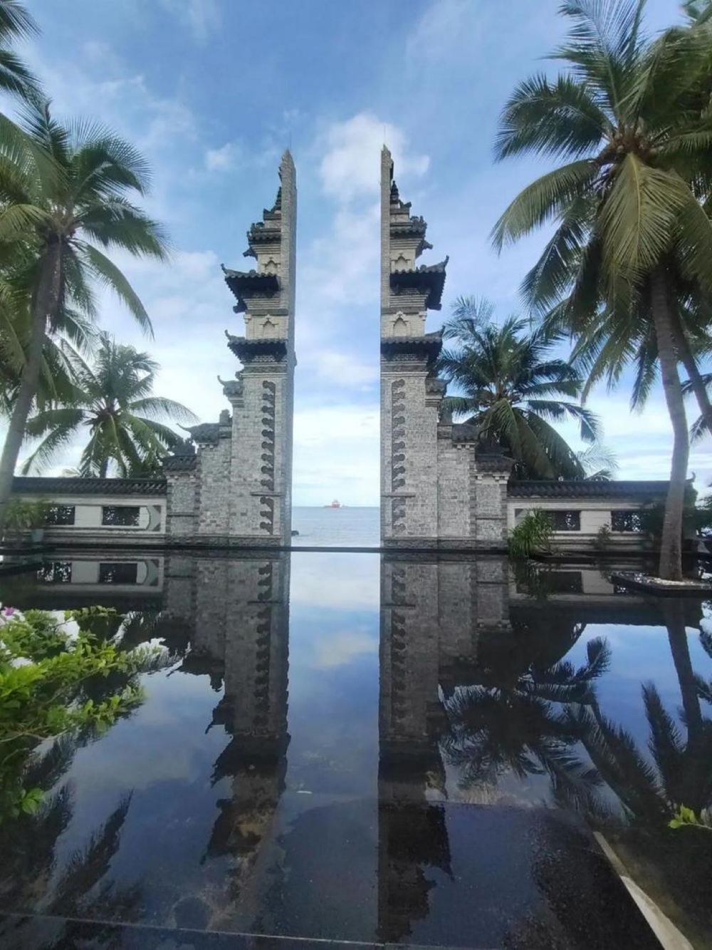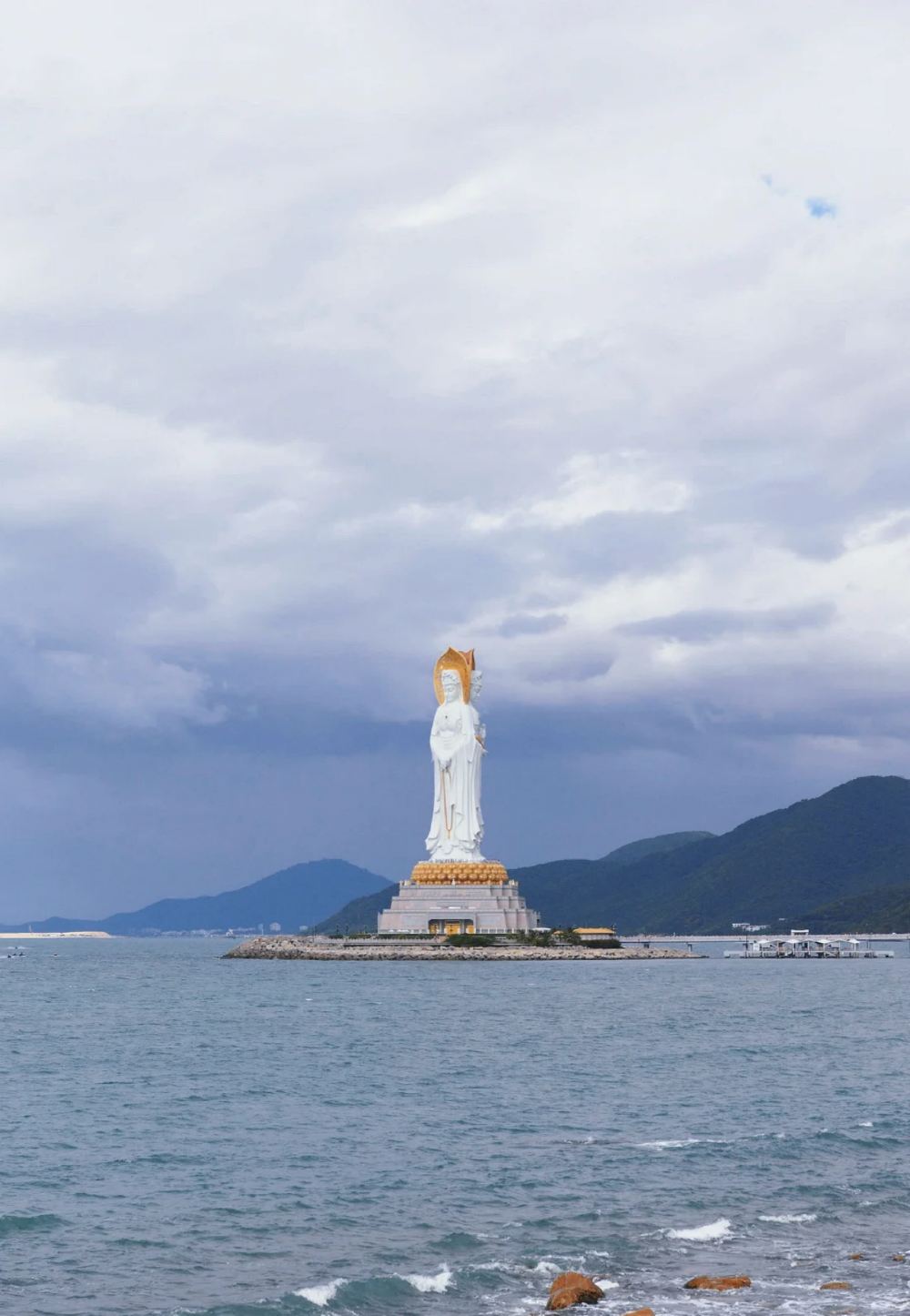 ▲ 南山海上观音圣像,高108米,巍然屹立于南海之滨。为一体化三尊造型,一面手持莲花,一面手持经书,一面手持佛珠,分别寓意智慧、平安与慈悲。