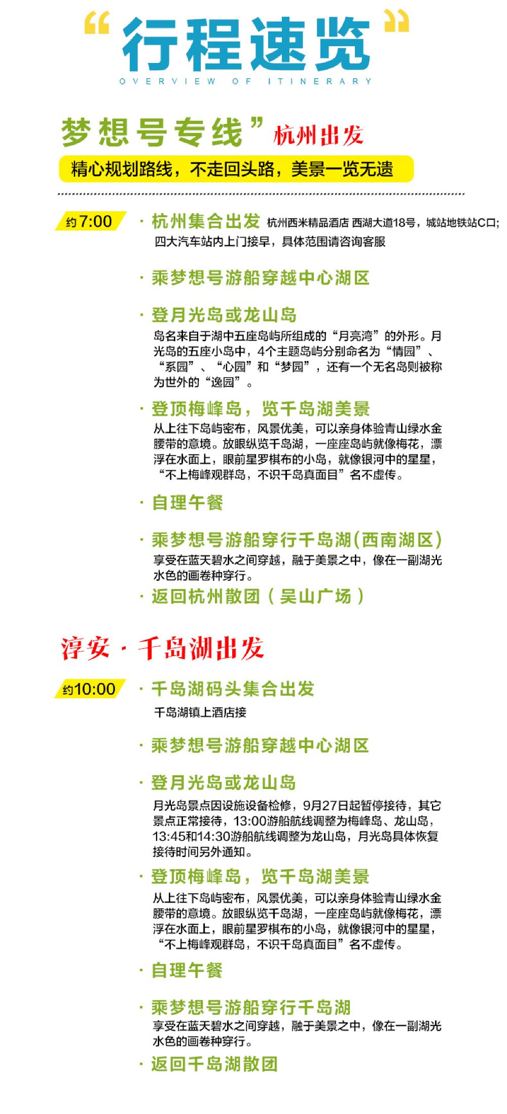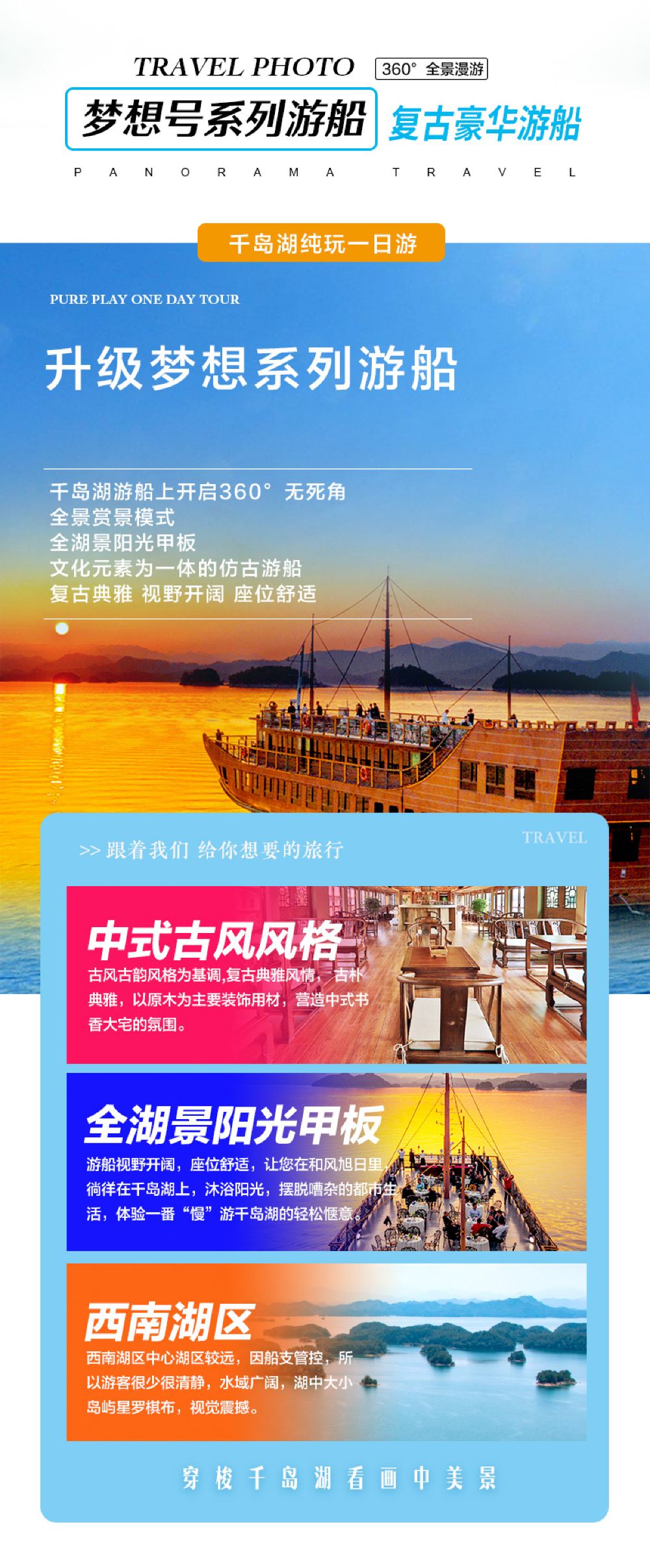游船升级:我们家的全景千岛湖,采用梦想系列游船-梦想5号/3号运营航线,造价千万以上,配备专属码头,只有船等人,不在常规码头人挤人,还可以在船上享用中餐,边赏景边用餐,尊享品质。