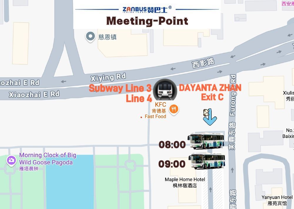尊敬的各位游客,我们的集合地点位于大雅塔站C出口附近,肯德基和便利店就在旁边,停车场安全可靠。我们的团队身穿蓝色背心,手持带有我们标志的标牌,每天都会在地铁站外等候,方便您轻松找到我们,不会错过。届时,导游会在这里迎接您,并协助您登车。