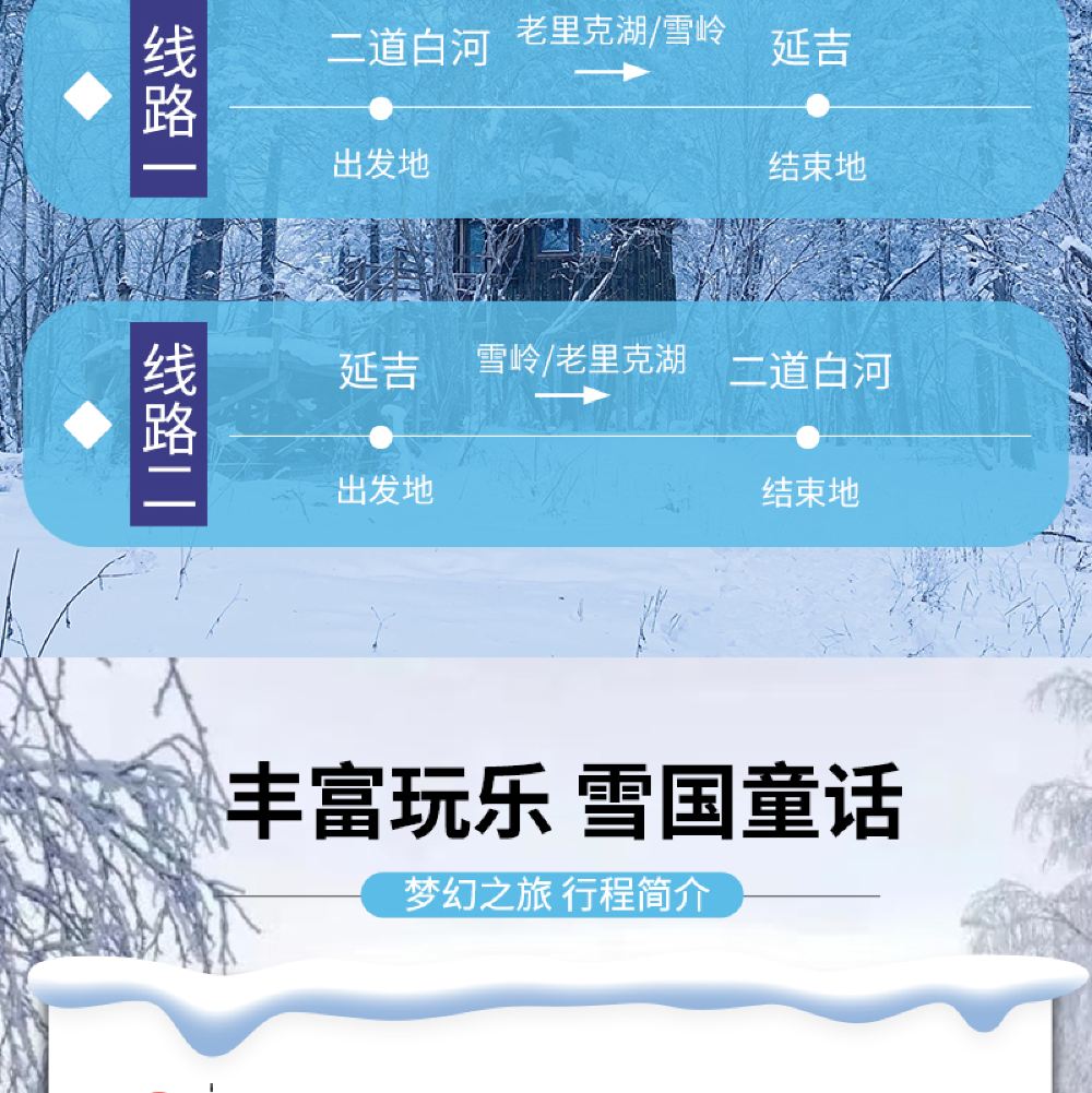 二道白河出发雪岭/老里克湖延吉结束送回延吉市区内客人指定酒店 注:由于时间关系老里克湖或雪岭只可二选一 两者区别不大