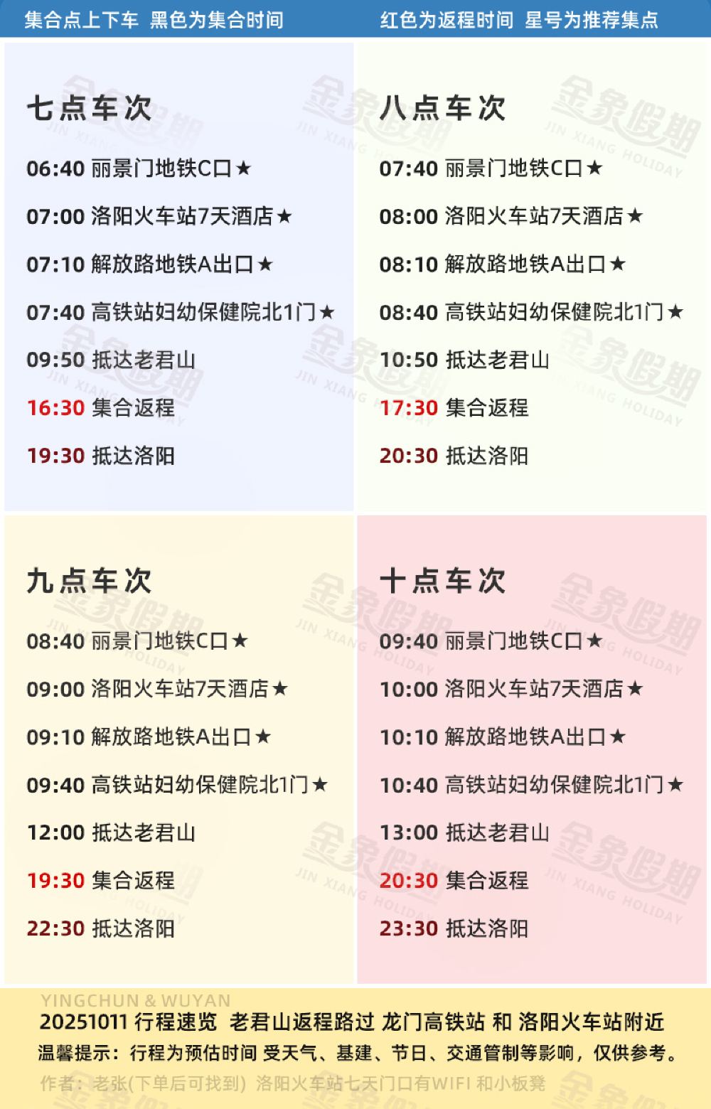 4、因景区人多,统一从洛阳出发,景区汇合无法接待。请您见谅。