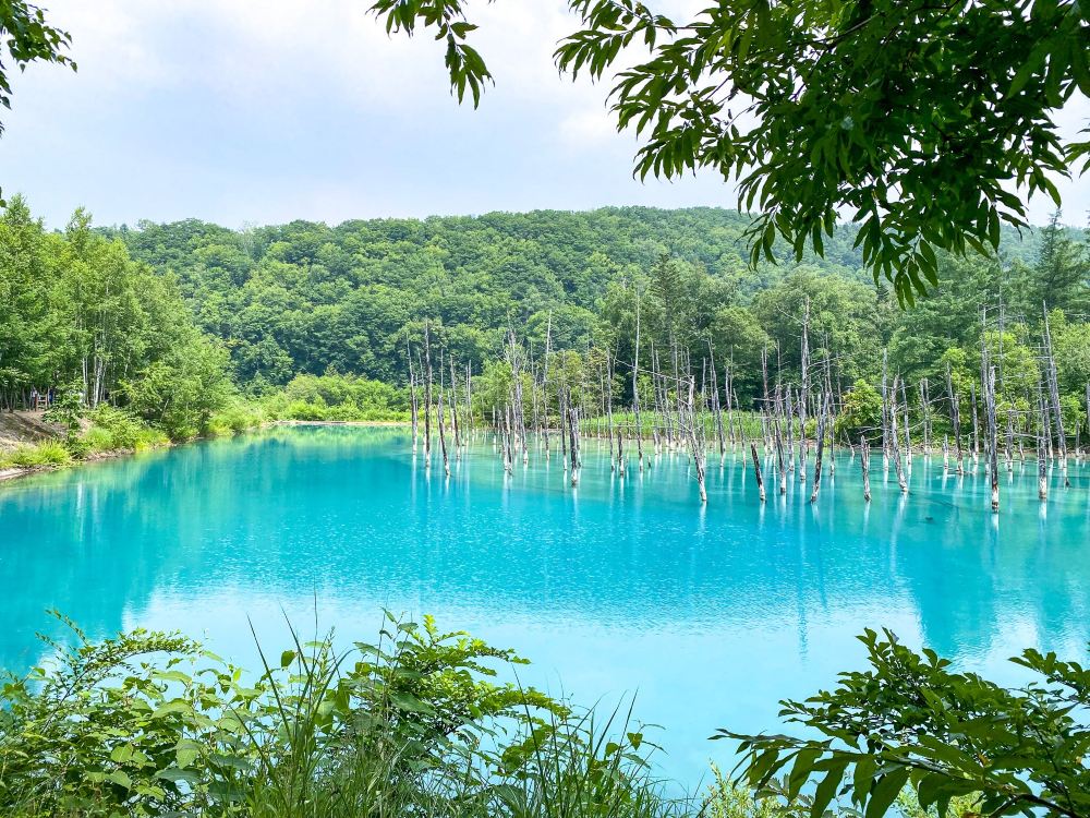 ▲ 青池位于北海道美瑛川左岸,因拦截火山岩浆修建的水坝截流而成,在阳光的照射下,青池会随着环境的细微变化,而呈现各种不同色泽。
