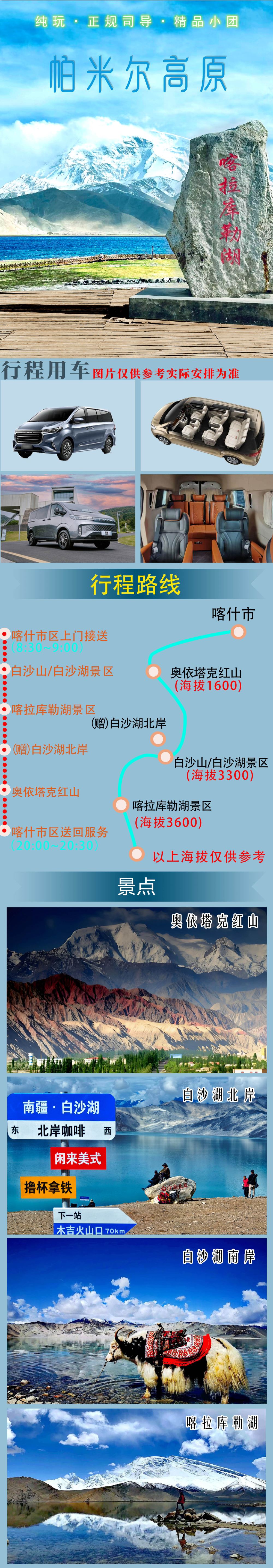 1、该行程景区、景点属帕米尔高原,最高海拔3600米,暂不接待孕妇,有心脏病、哮喘等病史的游客,及80岁以上的游客,敬请谅解!