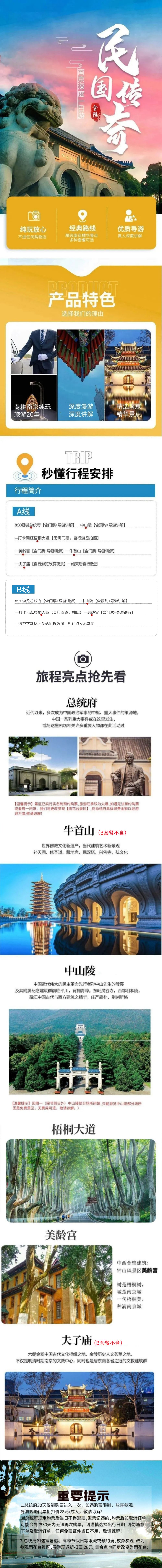 【温馨提示】:1.为避开景区人多嘈杂,提高客人旅游体验,导游可能会推荐使用耳麦,全程收费10元/人,自愿参加,不强制,如您不愿意,请紧跟导游步伐,以免影响讲解效果,敬请知晓!2.钟山风景区中有可能会乘坐景区交通(已导游安排为准),如乘坐10元/人/趟,自愿选择!3.因中山陵景区交通管制,旅游大巴无法驶入,需换乘景区内小交通,10元/人/趟,敬请谅解!4.A和B套餐为共同发团,B套餐无牛首山及夫子庙,美龄宫结束后散团,敬请知晓。