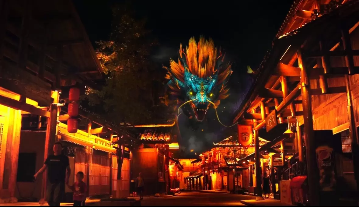 20:00老街大门开启,可由此进入梦幻的【时空之门】,观赏远古时期守护这片土地的【神兽迎宾】,上古崖壁化为天然巨幕上演“摩崖幻境”。
