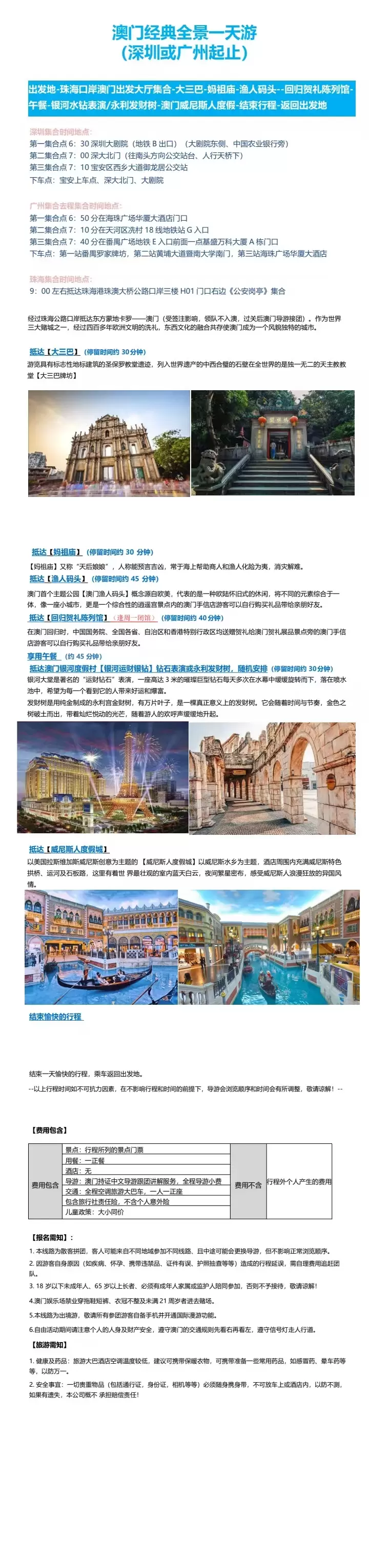 澳门大三巴牌坊+澳门渔人码头+澳门回归贺礼陈列馆+澳门银河度假区+澳门威尼斯人度假区一日游【澳门经典全景游】