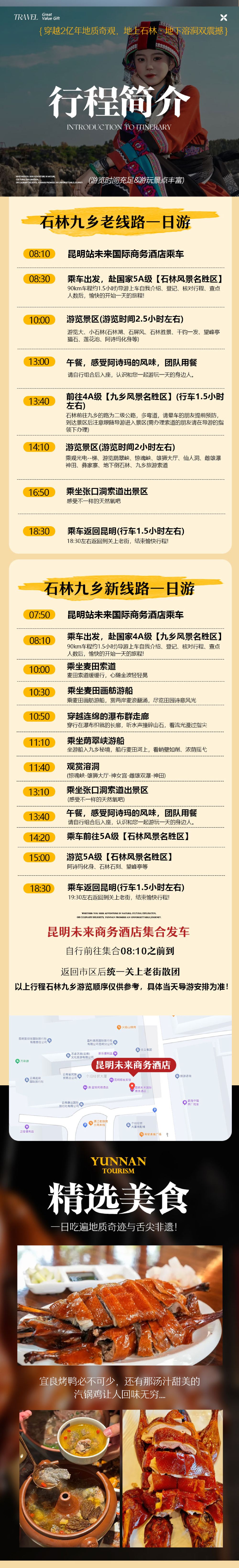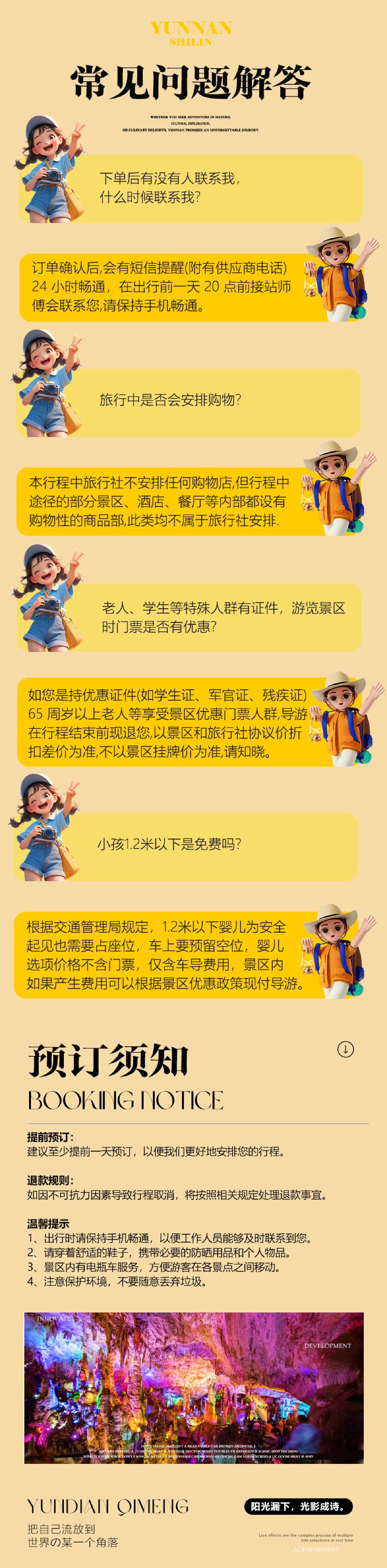 【温馨提示】儿童价格不包含门票,优惠人群拍儿童套餐后需购买景区半价门票(免票不买)+石林电瓶车25元/人+九乡索道168元/人。